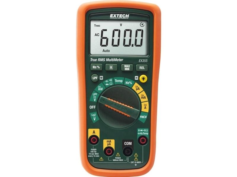 Digital-multimeter EX355Stort LC-display med baggrundsbelysning Måling af spændinger med variabel frekvens (LPF) Den Lo Z-tilstand beskytter måleværdier mod fantomspænding Automatisk og manuelt valg af måleområde 0,5 % DCV-nøjagtighed Auto-sluk (APO) med mulighed for deaktivering Temperaturmålinger med temperaturføler type K 10 A AC/DC-målinger Kontaktfrie AC-spændingdetektor Visuel og akustisk alarm ved forbindelsesmålinger Visning af batteriskiftDigitalt sand RMS multimeter med mange måle- og ekstra funktioner. Udover fjernbetjeningens standardkontrolknapper til DMM-funktioner er en lav impedans tilstand (Lo-Z) en displaybelysning, en berøringsfri AC-spændingstester og temperaturmåling med ekstern føler medfølger. xml-ph-00