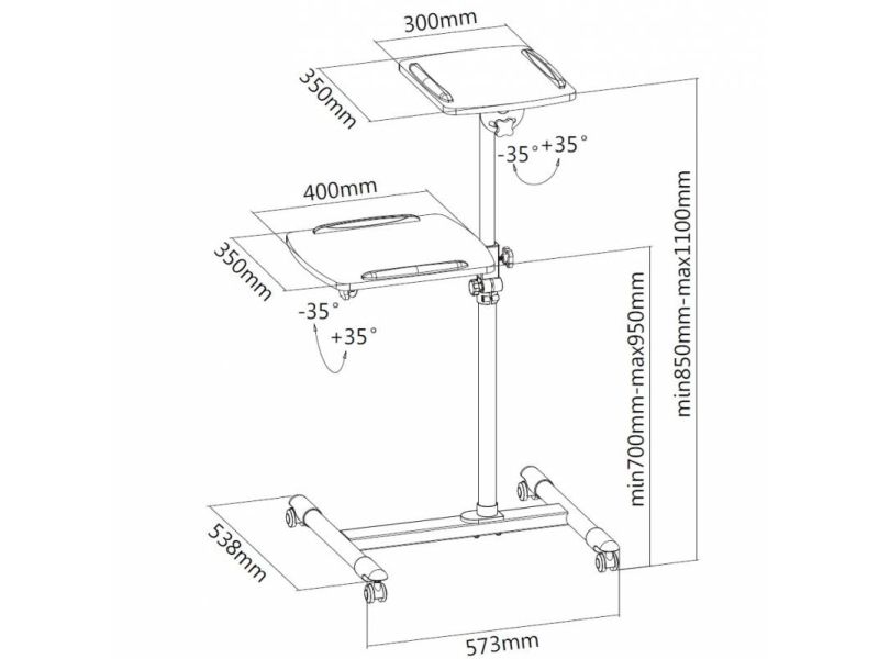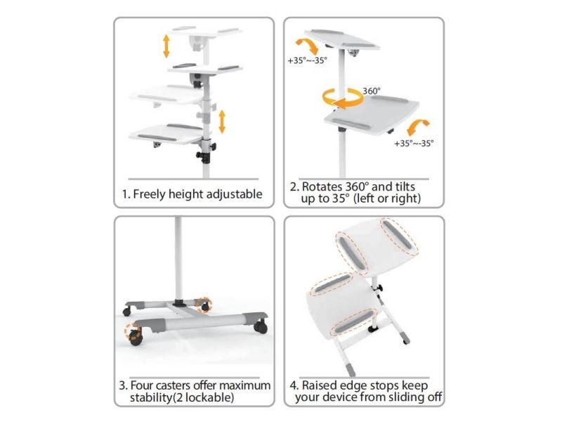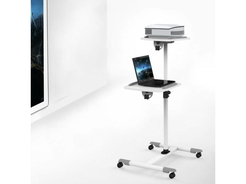 This height-adjustable cart is very versatile and has a large surface area that can hold laptop, projector, charger, mouse and more. Both platforms can be rotated 360° and 35° upwards and downwards to optimize the angle of typing, while the raised edges to prevent your device from slipping and falling. The mobile design with four wheels 2" offers greater stability. It's ideal for convention centers, hotels, meeting rooms, classrooms and showrooms.