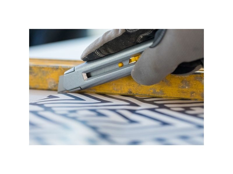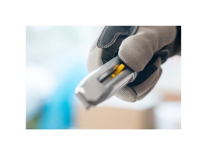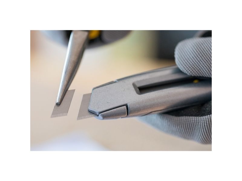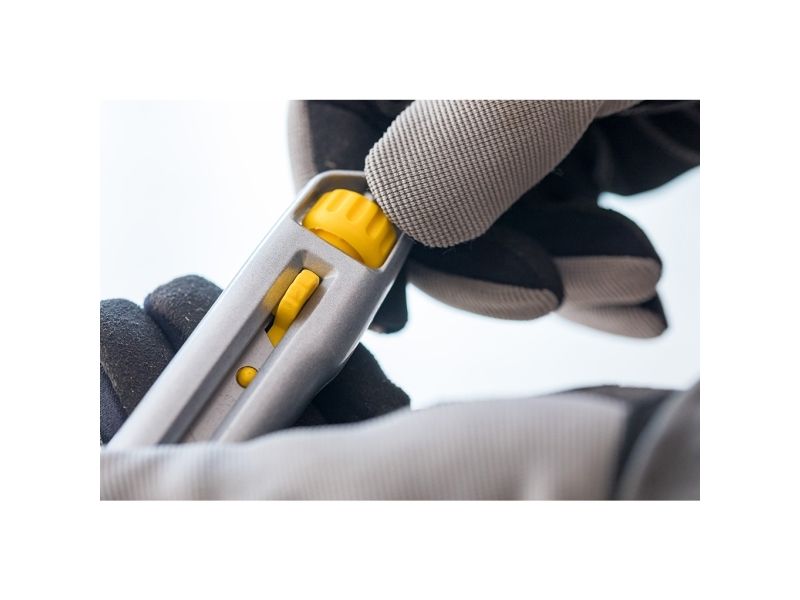 Tryckknapp och effektiv bladlåsning med tandad rulle med krok för ökad säkerhet och exakt skärning