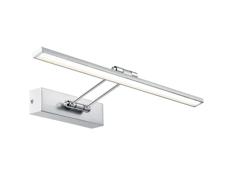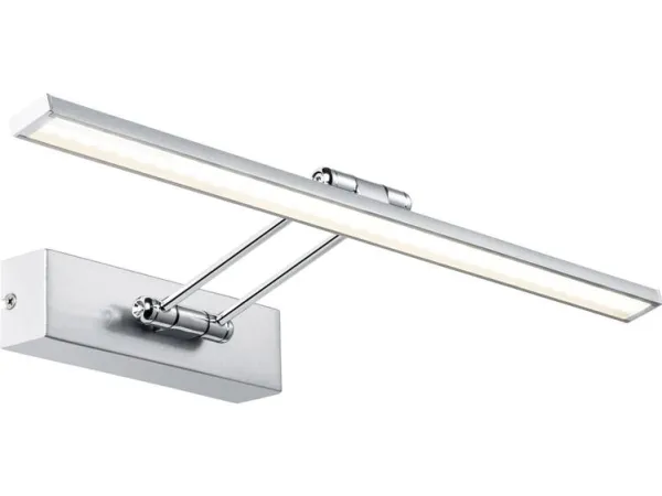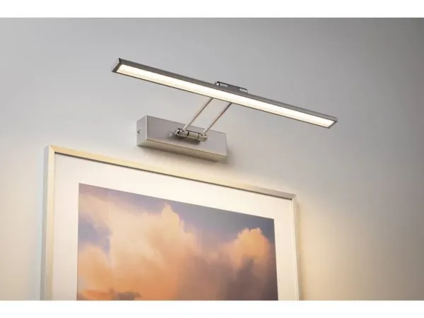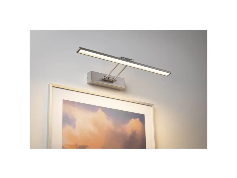The Galeria LED picture luminaire Beam Fifty 7 W brushed nickel\nIncl. lamps\nThe Fifty picture light excels at putting your artwork in the limelight. It is installed directly over the picture and can be individually adjusted thanks to its two joints, guaranteeing optimum illumination. The linear design goes with every interior style and warm white light creates a pleasant atmosphere in the room.