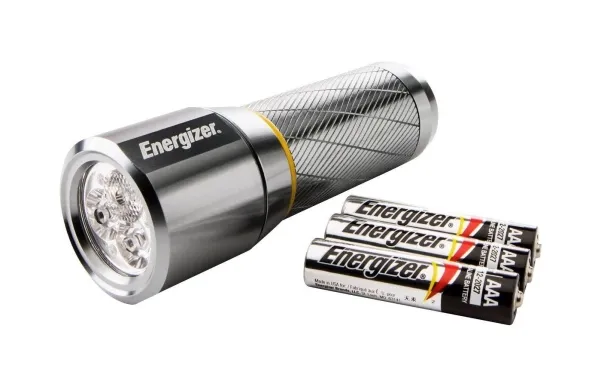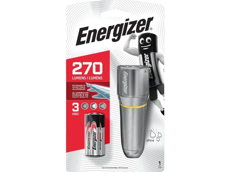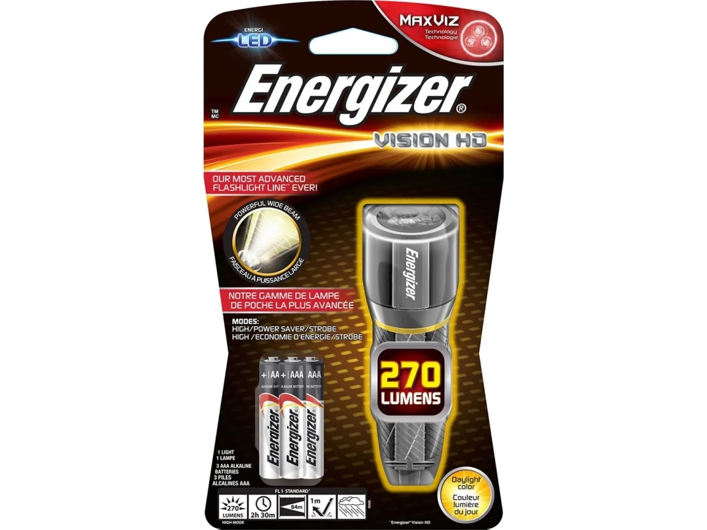 Ficklampa, Energizer Vision HD Kompakt LED-ficklampa med intensivt ljus Hållbar arbetslampa som tål regn och att tappas från 1 meters höjd Ficklampa har 1 LED-lampa och ett starkt aluminiumfodral med bärrem Bra grepp med mönstrad yta Vattentät: Motstår vattenstänk från alla håll (IPX4) Ljusstyrka: 270 lumen Använder 3 AAA-batterier som ingår i förpackningen Beställningsenhet: st.