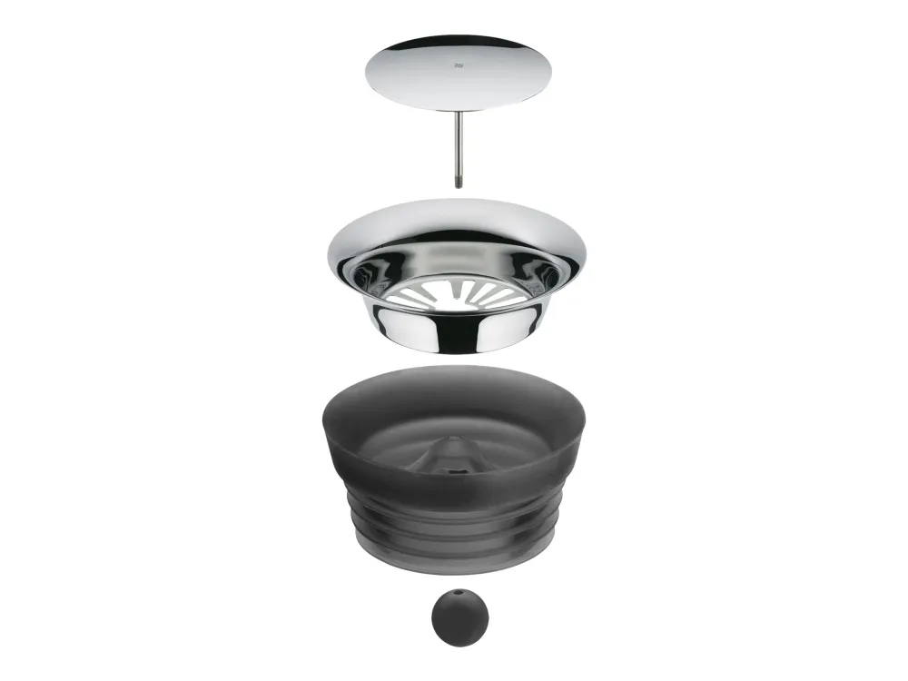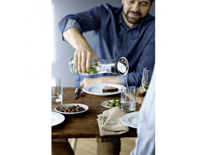 The Basic collection includes water carafes with practical CloseUp stoppers from design agency Köhler & Wilms. The tilt mechanism opens and closes automatically when pouring and an integrated strainer holds back ice cubes and pieces of fruit. The glass carafes with matching water glasses are available in three different sizes for 0.75 to 1.5 litres, with or without handle and in fine polished Cromargan® 18/10 rust-free stainless steel. All carafes can be cleaned in the dishwasher and fit into the drinks compartment of any standard refrigerator. Those wanting to cool their water at the table can place the carafes in cooling rings, specially designed by WMF for the Basic collection.