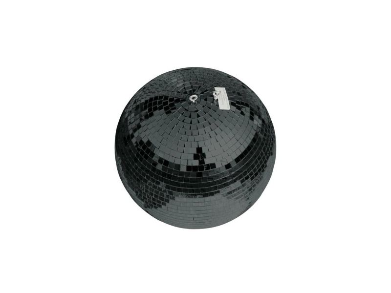 This model in professional quality has a diameter of 50 cm and is covered with countless small black mirrors (10 x 10 mm). The robust plastic core is covered with hundreds of small mirror facets and features a continuous shaft guaranteeing a high tensile strength. The mirror ball also includes two eyelets allowing for attaching both the fastening chain and the required fall protection.