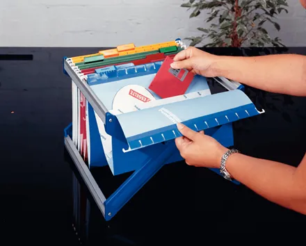 mörkgråHängande mapp av högkvalitativ plast. Med anodiserad alu-profil och möbler gentle glide-fötter, hopfällbar. Volym: för 25 hängande mappar. Mått: BxHxD 355x255x310mm.