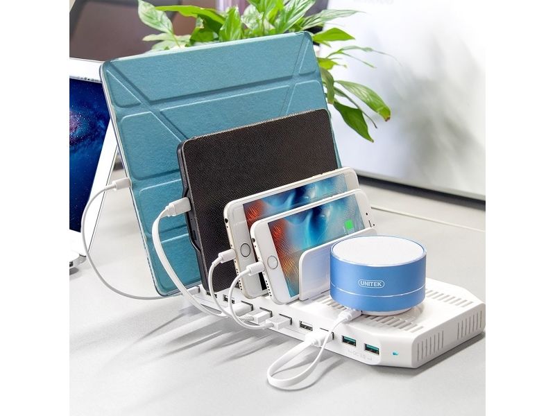 Uniteks smarta laddningsstation är en pålitlig lösning för laddning av flera enheter samtidigt. Med en uteffekt på 96 W och tio USB-A-kontakter kan den effektivt användas för en rad olika enheter, vilket garanterar snabb och effektiv laddning av alla dina enheter. Det här laddningsstället inkluderar en nätadapter, vilket gör det enkelt att installera hemma eller på kontoret.