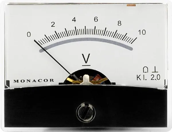 Moving coil panel meter;#With mirror scale;#All-plastic housing;# Quality class 2;#Zero point correction;#Prewired for illumination;#Measuring range: 10 V;;For illumination purposes, these panel meters can subsequently be fitted with two LEDs with series resistor.;Manufacturer information:;MONACOR INTERNATIONAL GmbH & Co. KG