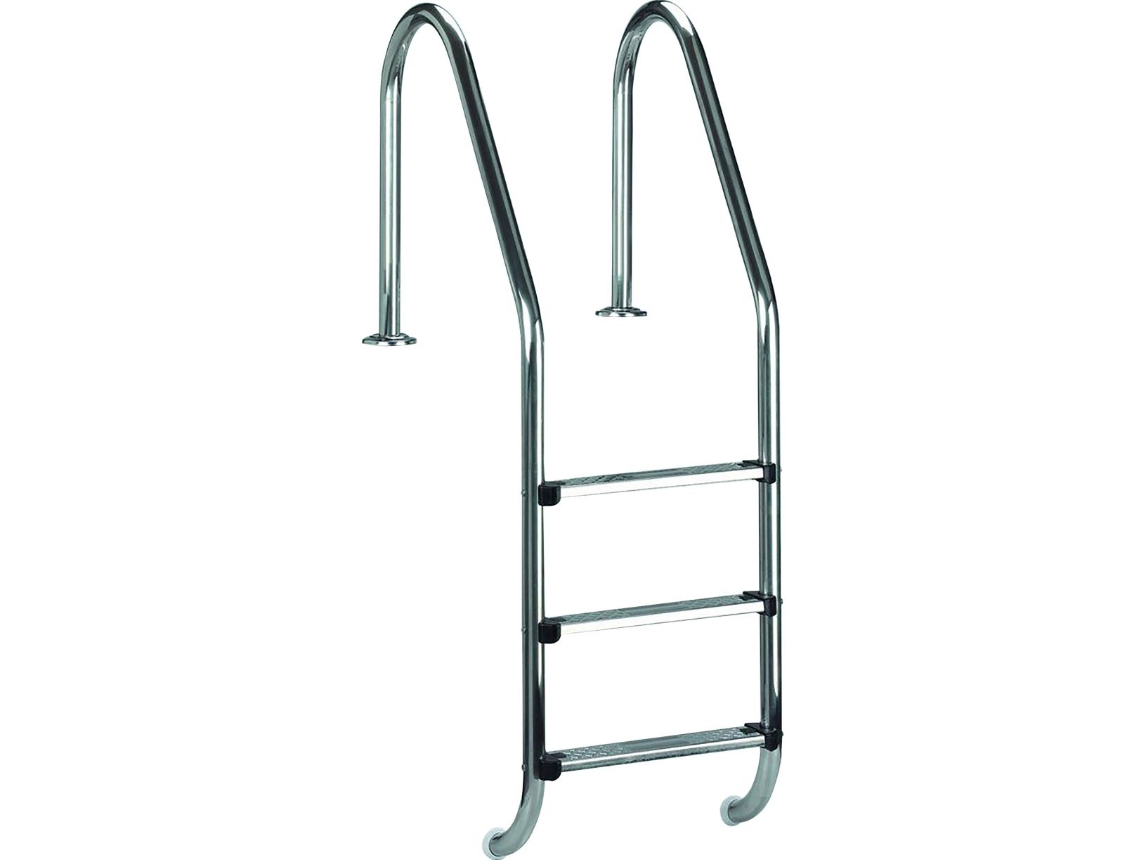 Stegen har halkfri säkerhetsbeläggning. Fittings för montering på kakel eller terrass ingår. Stegen lämpar sig inte att användas i saltvatten. AISI 304.