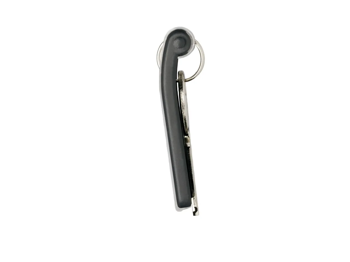 Nyckelbricka där nyckeln hänger bakom brickan vilket gör att etiketten alltid syns.