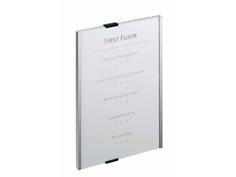 Stylish range of door and wall signs with ribbed aluminium backing, anti-glare acrylic window and stylish offset fixing caps, with free downloadable templates.\nSize: 210 x 297 mm.\nFor INFO SIGN printable insert sheets (computer compatible), see ref. 4856.