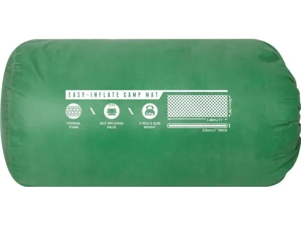 EASY-INFLATE CAMP MAT\n- Fabric: 190T polyester\n- Self-inflates with an integrated foam core, simply unroll the mat and it’s ready to use\n- Built-in thermal foam offers superior comfort\n- Light weight and easy to carry\nContents: One self inflate mat, one carry bag