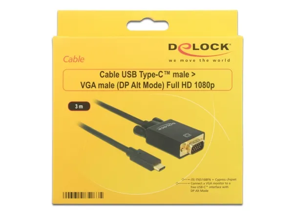 This cable by Delock enables the connection of a VGA monitor to a PC or laptop with USB-C™ or Thunderbolt™ 3 port, such as a MacBook or a Chromebook. The interface has to support the Displayport Alternate Mode.