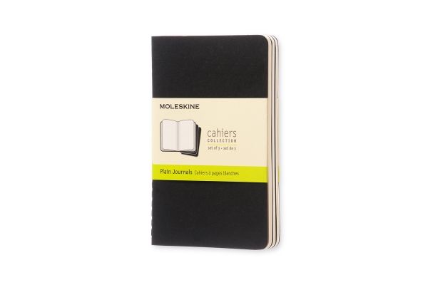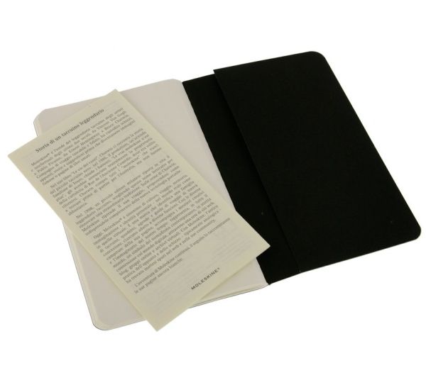The Moleskine Cahiers are journals with a flexible heavy-duty cardboard cover in black with visible stitching on the spine. The last 16 sheets are detachable and there is a pocket for loose notes. Each set of 3 pieces includes the Moleskine history. With acid free paper plain pages.