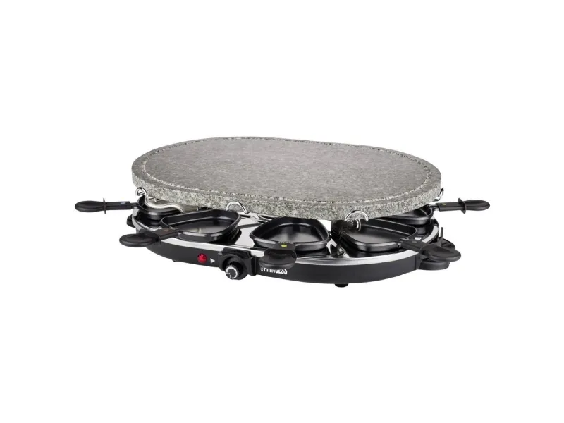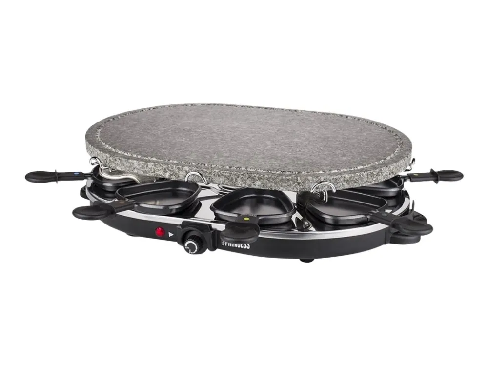A combination of raclette and stone grill set in one. The removable oval stone grill can be used to grill meat, fish and vegetables. Butter or oil is unnecessary, which makes this a healthy, low-fat option!