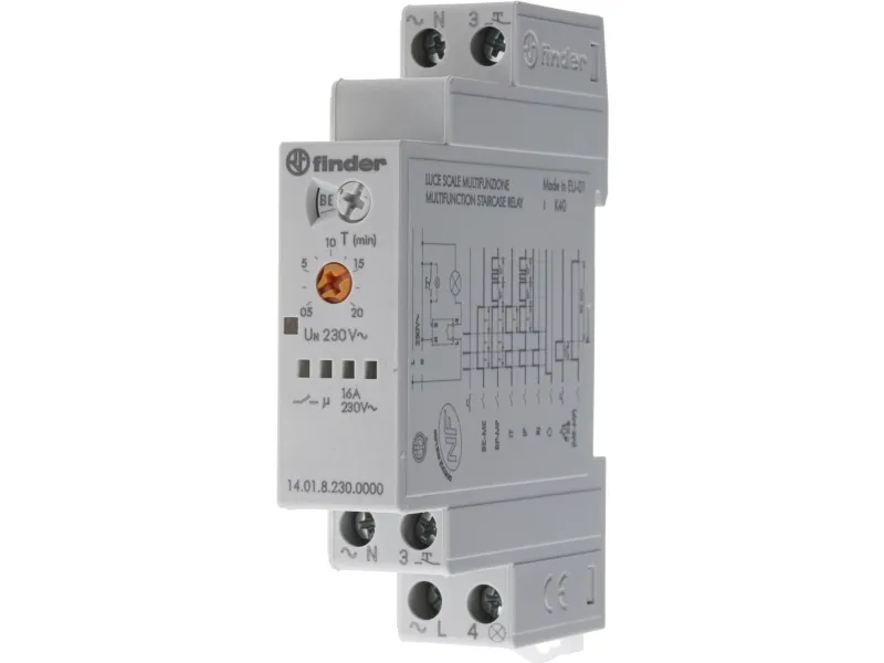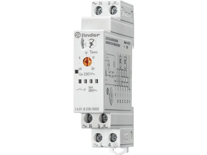 Multifunktions-trappeautomat med 6 funktioner, serie 14.01.8.230 .0000LED-statusindikator. Sikkerhed takket være slukkeforvarsel (lyset blinker). Forlængelse af belysningstiden ved knapbetjening. Skift ved spændings-nulgennemgang skåner pæren (længere levetid). Kan også anvendes som kiprelæ (3 programmer). Enheden råder over følgende programmer: BE: Tidlig genstart af belysningstiden. Mulighed for tidsstyret genstart efter knapbetjening (åbne) undervejs i det forvalgte tidsintervals forløb. BP: Genstart af belysningstiden og forvarselsfunktion (lampen blinker) før udløb. Mulighed for tidsstyret genstart efter knapbetjening (åbne) undervejs i det forvalgte tidsintervals forløb og forvarselstid på 20 sek. IT: Efter betjening af knappen slutter udgangskontakten. Under tidsintervallets forløb kan belysningen slukkes igen, før tiden er udløbet. IP: Mulighed for s