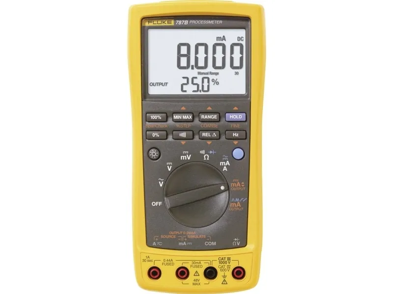 Fluke 787B Process Meter™Afspil/mål/simulering af 20-mA-jævnstrøm · Samtidig visning af værdi i mA og % af måleområdet · Digitalt multimeter med godkendt sikkerhed iht. IEC 61010, målekategorien CAT III 1000 V og CAT IV 600 V · Kompatibilitet med Fluke Connect® til trådløs dataoverførsel og -optagelse (med ekstra modul IR3000FC) · Førsteklasses ægte-effektivt digitalt multimeter (1000 V, 440 mA) · Frekvensmålinger op til 20 kHz · Driftstyper minimum/maksimum/gennemsnit/hold/relativ værdi · Diodetest og gennemgangssummer · Manuel niveaufunktion (100 %, 25 %, grov og fin), samt automatisk trin- og rampefunktion · Udefra tilgængelig batterirum til enkel udskiftning af batteri. Det Process Meter™ Fluke 787B udvider dine muligheder ved fejlsøgning, da denne kompakte måleapparat ydeevnen på et digitalt multimeter med højeste sikkerhed og af stromschleifenkalibrators forener. Bygger på de funktioner det robuste digitale multimeter Fluke 87 har du nu med den 787B desuden mulighed for