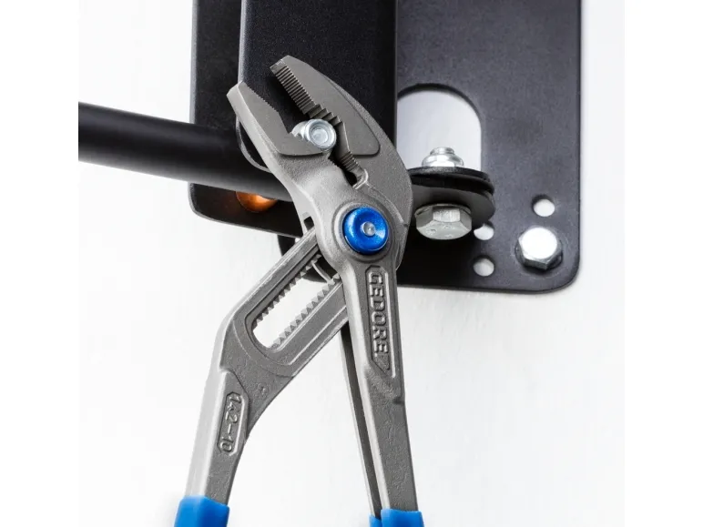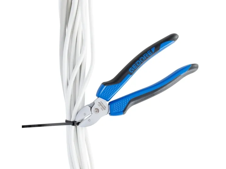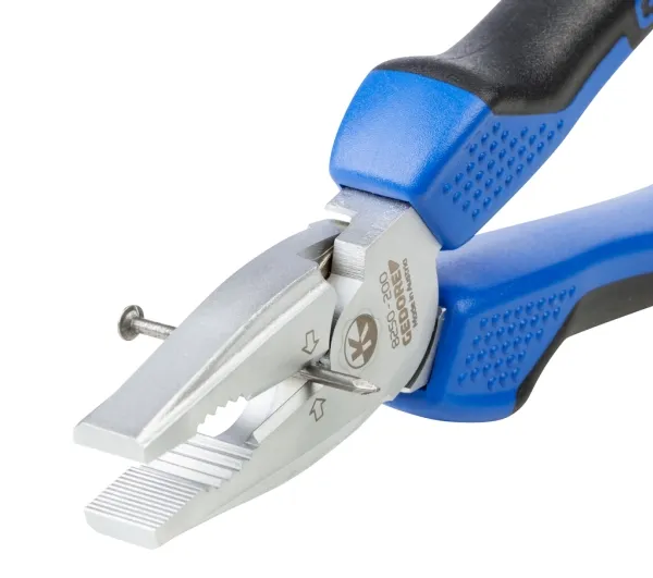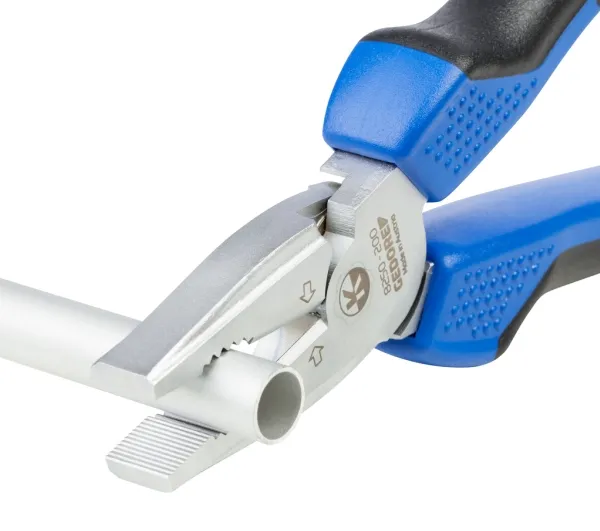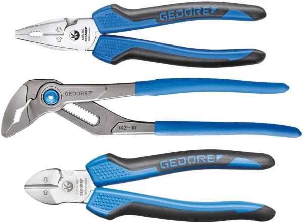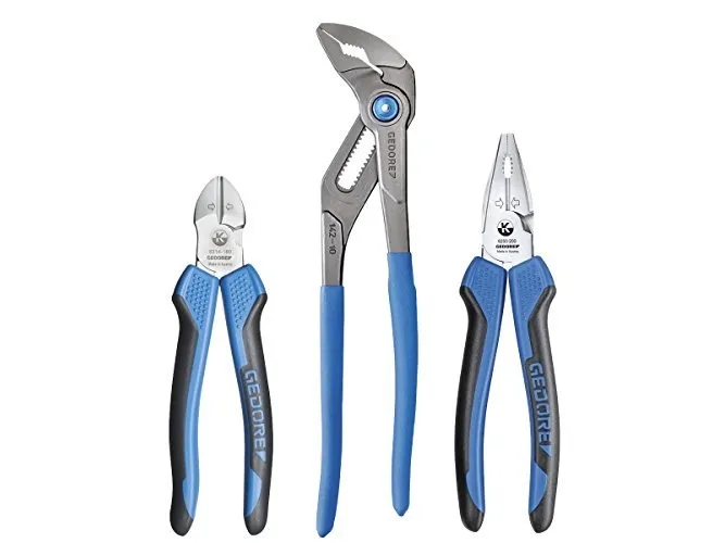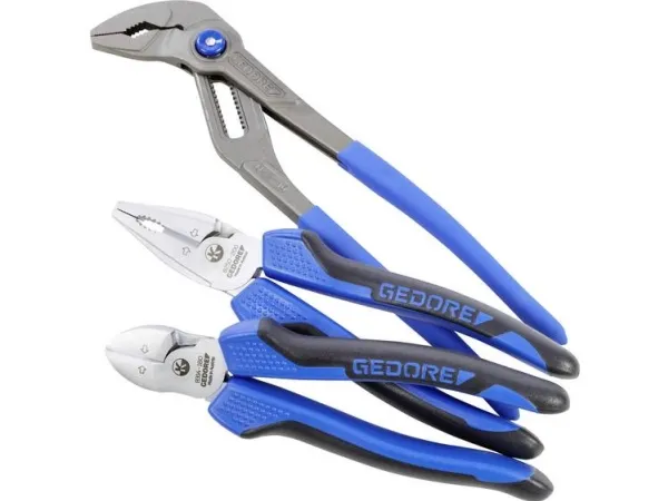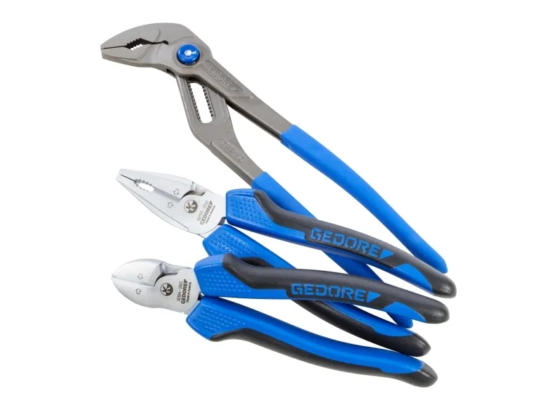 Consisting of universal pliers 142 10 TL, power combination pliers 8250-200 JC and power side cutter 8314-180 JC, Swedish pattern Best cutting power (Bcp) reveals the optimum cutting point under perfect power utilisation 8314-180 JC Power side cutter: High force build-up due to convex handle shape and forwardly shifted pivot point in the joint Induction-hardened cutting edges 63-65 HRC Gedore special hardened and tempered steel, chrome-plated 2K handle sleeves cutting capacity: 25mm²/AWG4, piano wire max. 2.0 mm, copper wire max. 6.00 m 8250-200 JC Power Combination Pliers: For heavy continuous use High force build-up due to the forward displacement of the pivot point in the joint Induction hardened cutting edges 62-64 HRC GEDORE special hardened and tempered steel, chrome-plated 2K handle sleeves cutting capacity: 25mm²/AWG4, piano wire max. 2.0 mm, copper wire max. 6.00 mm 142 10 tsp water pump pliers: Self-clamping gripping on pipes and nuts 15-fold fine adjustment at the touch of a button Good accessibility in narrow areas due to slim pliers head Induction hardened teeth 61 HRC Steel grey with blue dipped rough handles