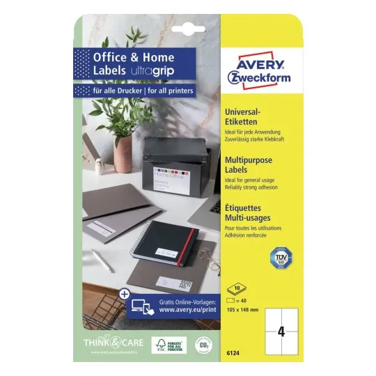 Har du flere forskellige typer printere på kontoret? Intet problem, du behøver kun købe én slags etiketter, for med Avery’s hvide 6124 Universaletiketter med Ultragrip til indendørsbrug med 4 etiketter/ark og 40 etiketter/pk, får du etiketter der kan bruges til både s/h- og farvelaserprintere, inkjetprintere samt kopimaskiner. Så behøver du ikke længere bekymre dig om du har lagt etiketterne til Inkjetprinteren i Laserprinteren.