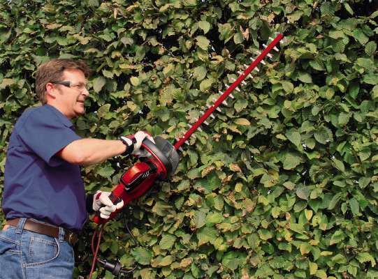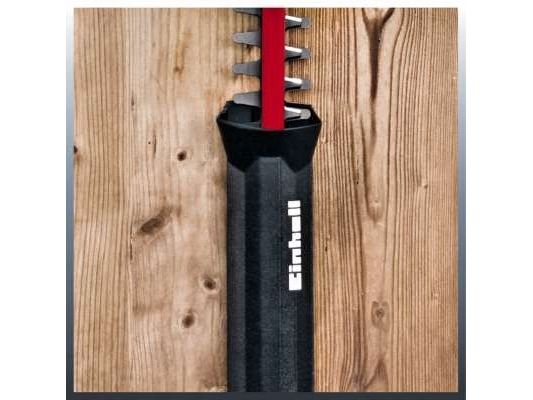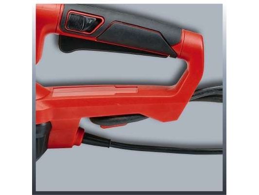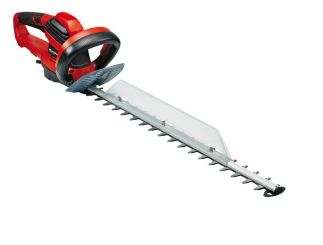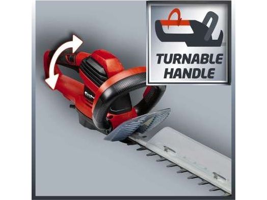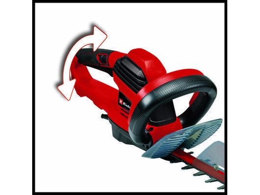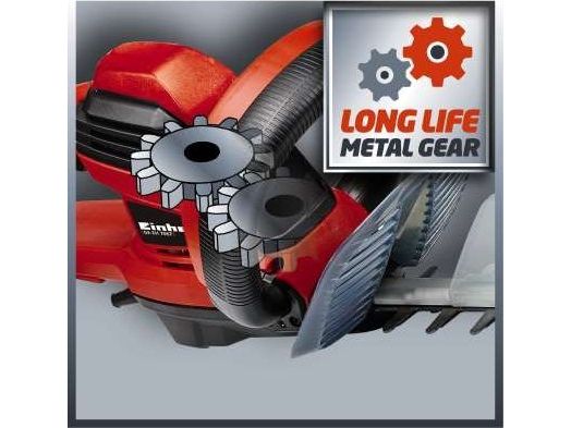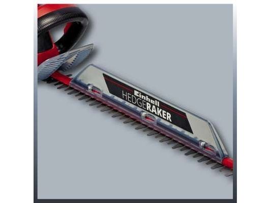 With the Einhell GE-EH 7067 electric hedge trimmer trimming hedges, shrubs and bushes is done with ease. With a cutting length of 670 mm and a 700 W rating it is a powerful helper. The cutters are made of laser-cut and diamond-ground steel. A long service life is guaranteed by the metal gearing. The rear handle can be swiveled. Safety is provided by the two-handed safety switch which stops the cutters in less than a second. A large hand guard, aluminium cover over the cutters and an impact guard are further advantages of the hedge trimmer. Comfortable removal of the cuttings from the top of the hedge is ensured by the practical cuttings collector. Supplied with a sturdy cutter guard for transport and storage.
