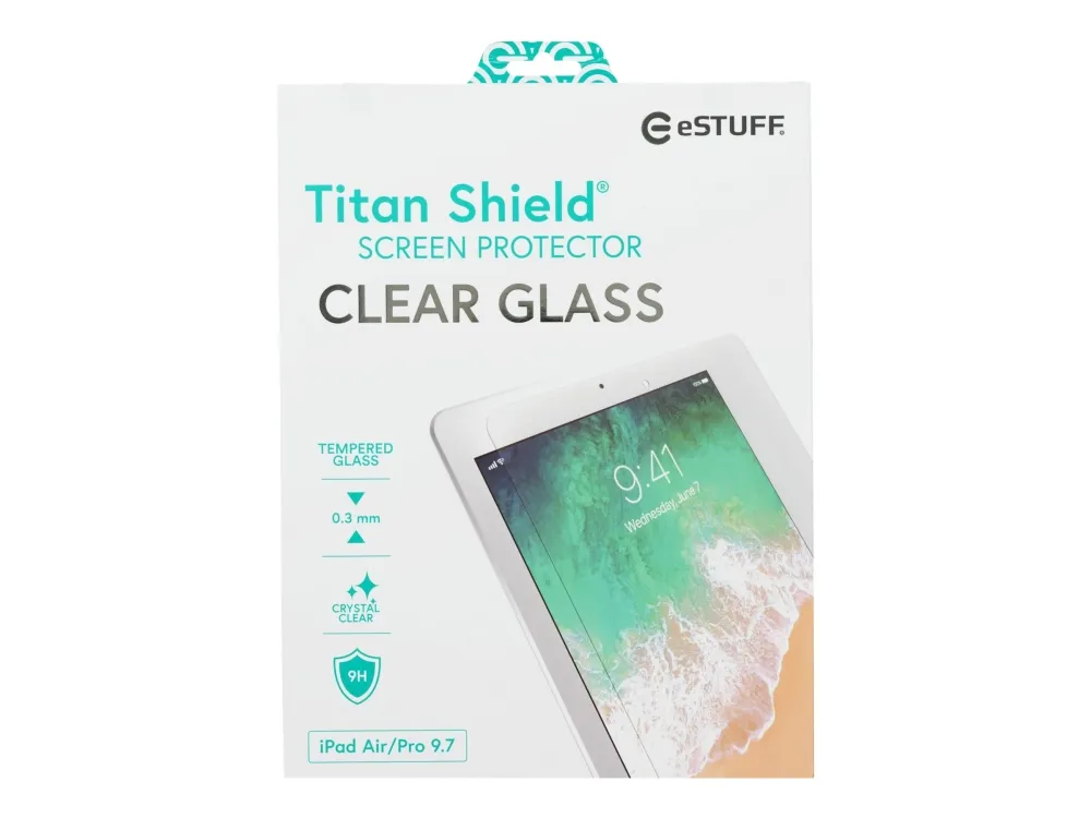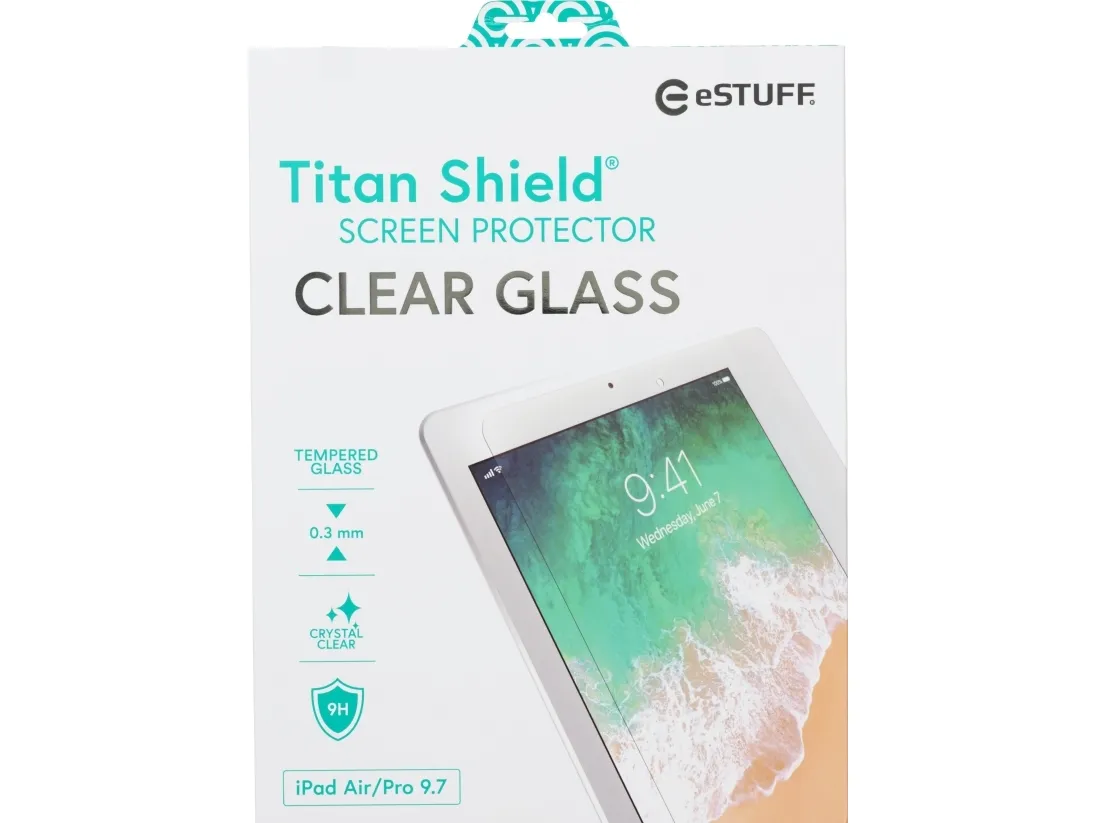 Titan Shield is a ultra-tough piece of real, 0,33 mm thin, Japanese, tempered glass that provides the ultimate protection for your display against scratches, chips and cracks.\n\nTitan Shield clear glass covers the flat part of the screen and is very easy to apply.\n\nThanks to the real glass properties there is no change in color or touch experience when the screen protector is applied. If your device is exposed to excessive force the Titan Shield is designed to break. This will absorb most of the force and in most cases protect your display from harm. The Titan Shield glass is 9 times stronger than ordinary glass.\n\nSuits: iPad Air, iPad Air2, iPad Pro 9.7", iPad (2017), iPad (2018)\n\n- 9H (9 times stronger than normal glass)\n- Impact resistant\n- Scratch resistant\n- Crystal Clear glass\n- 100% touch preservation\n- Rounded edges\n- Oleophobic coating\n- Anti shatter film\n- Cleaning kit included