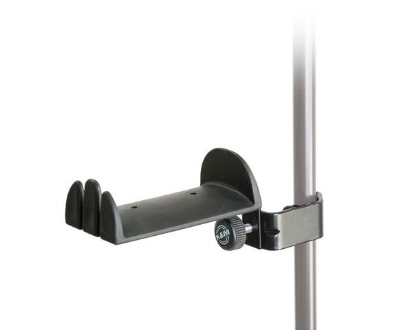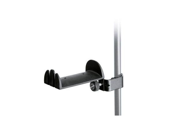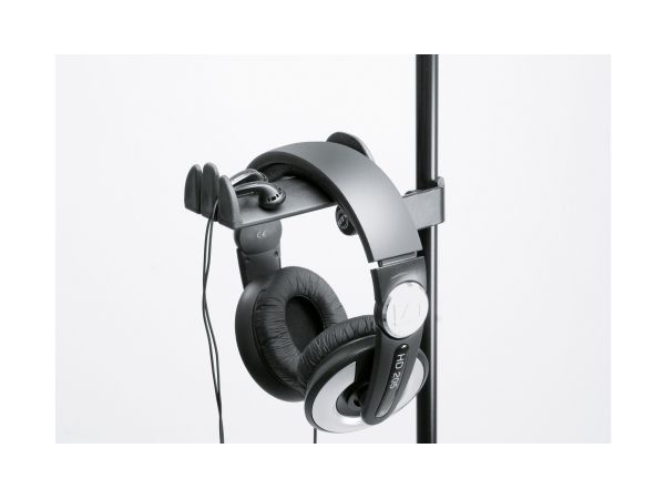 A holder for headphones when not in use. The new headphone holder is simply clamped to the tubes of a music stand or microphone stand, etc. and is generally suitable for a tube diameter max. 30 mm. The soft rubber support can easily take two sets of headphones. In addition, 2 in-ear headphones can also be hung on the slotted front of the holder. The headphones are close to hand and out of harm's way.