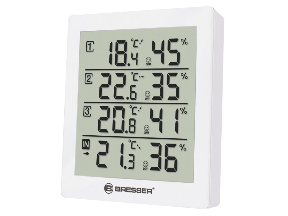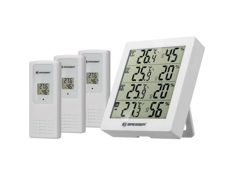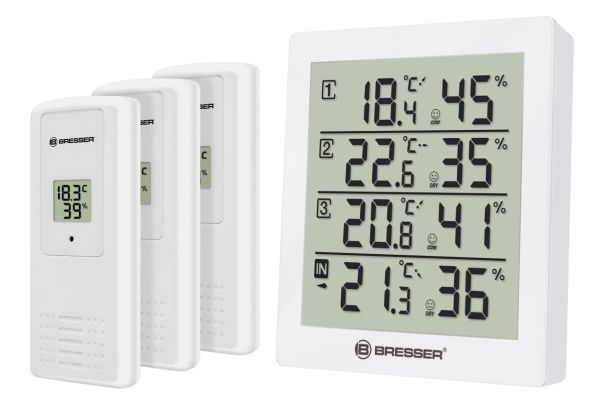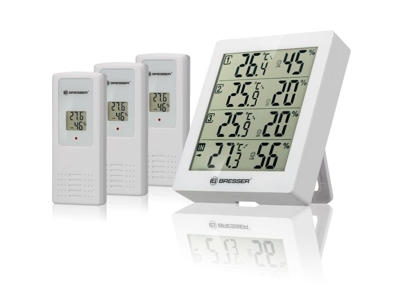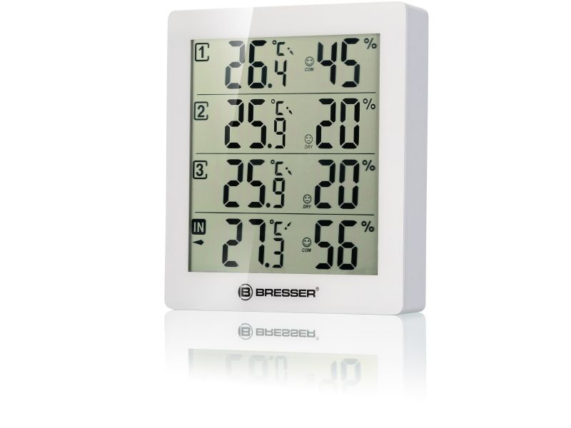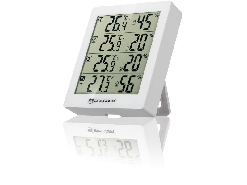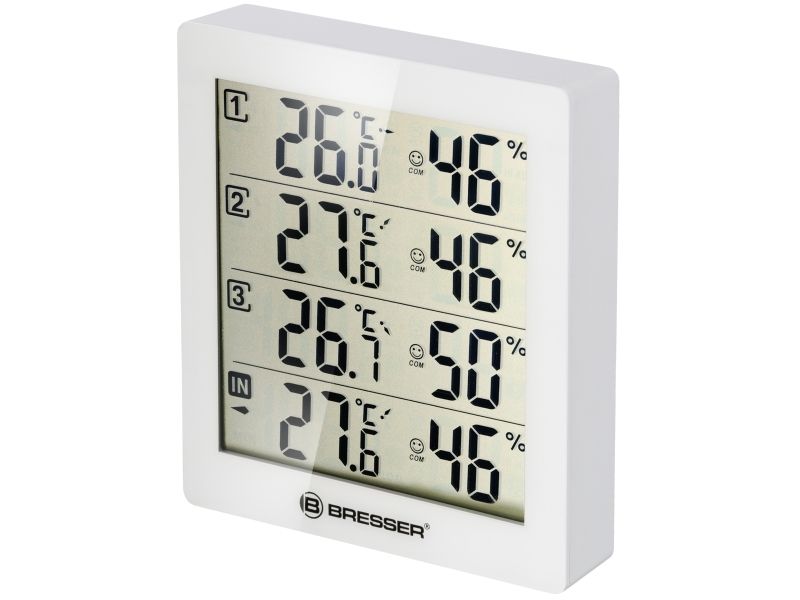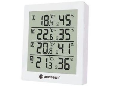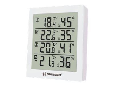 The BRESSER Temeo Hygro Quadro offers the possibility to measure temperature and air humidity in or around your house at 4 different locations.