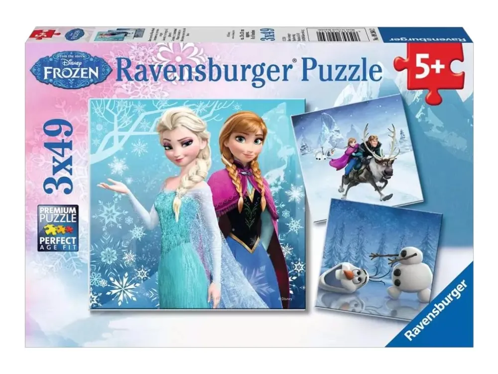 Disney's enchanting film Frozen, inspired by the story of The Snow Queen, is currently the world's most successful animated film, thanks to the great story, music and amazing graphics. This set of high-quality cardboard puzzles depicts key characters from the film. Each puzzle is cut to 49 pieces. All three of the puzzles are printed with a different reverse side, so the puzzle pieces can be easily sorted before assembly.