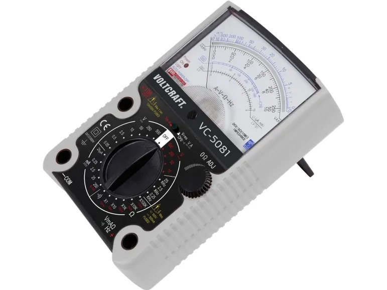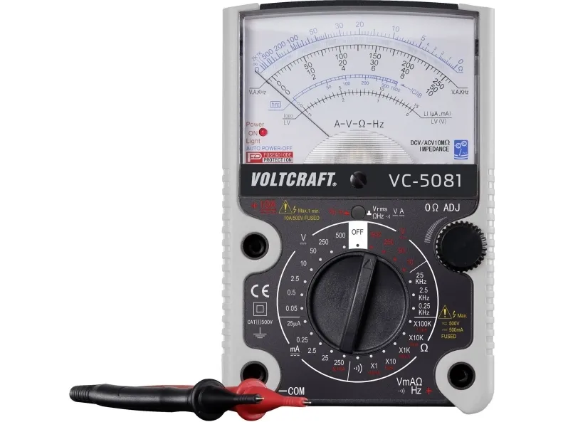 Analog multimeter VC-5081Mätområden V/AC, V/DC, A/DC, frekvens, diodtest, transistortest, akustiska kontinuitetstester, automatisk avstängningsfunktion. Analog multimeter med omfattande mätområden och spegelskala. Tack vare den extremt tåliga klämmekanismen i kombination med överbelastningsskyddet för ingångarna är VC-5081 praktiskt taget oförstörbar. Genom ingångsimpedansen på 10 MΩ i alla spänningsmätningsområden är den uppmätta spänningen endast mycket lätt belastad, vilket gör att noggrannare mätvärden kan erhållas.