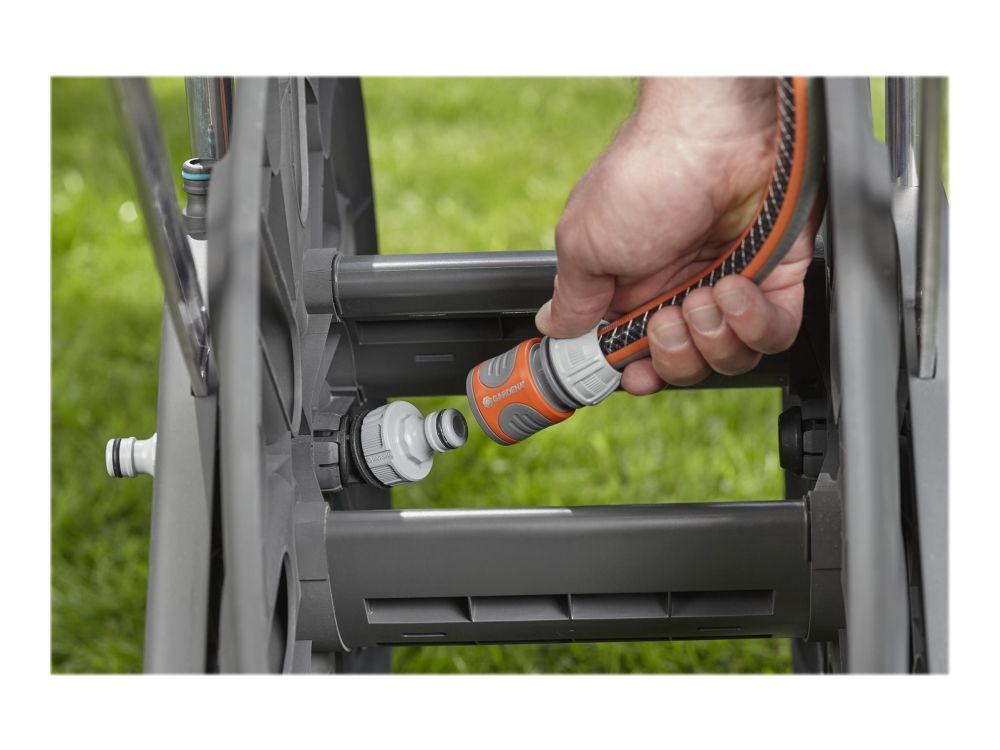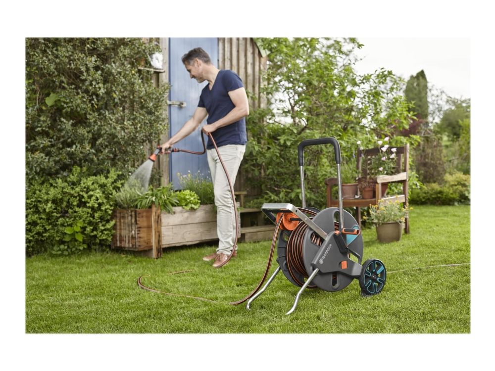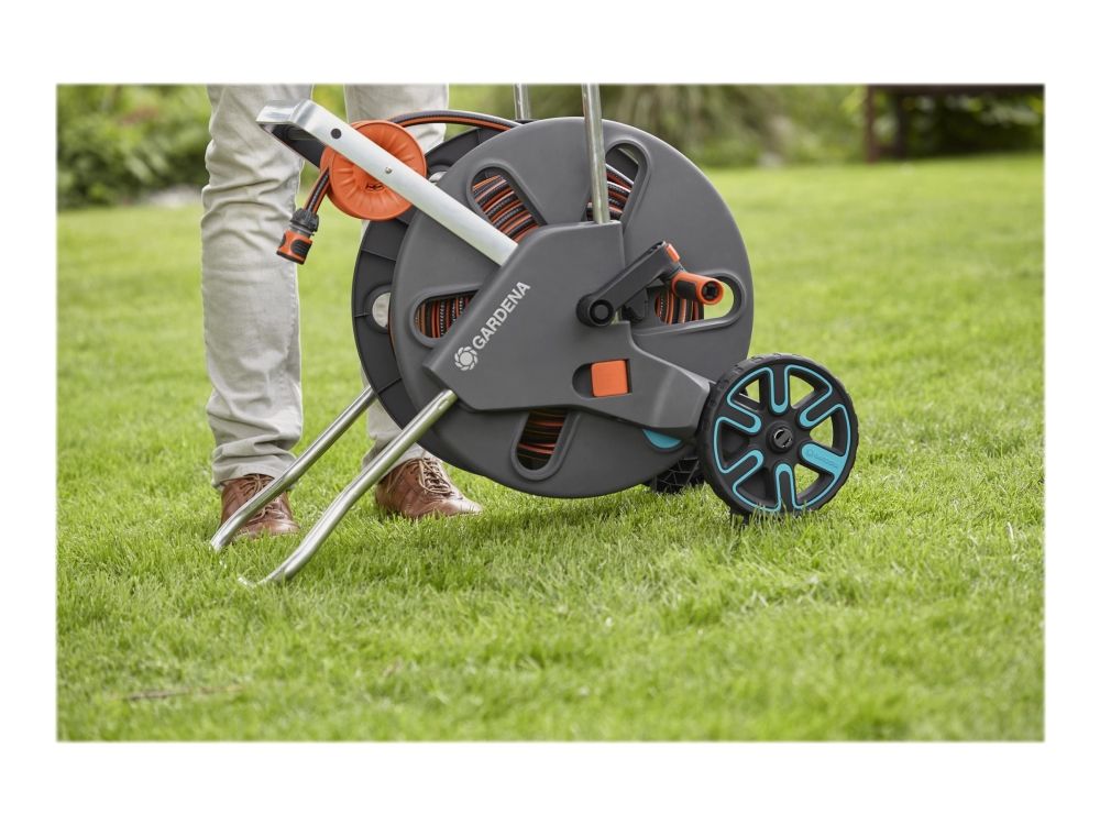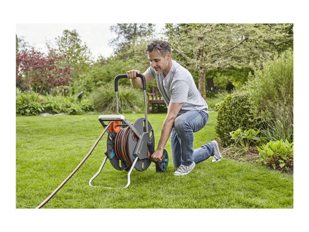Slangvinda som underlättar bevattning och är perfekt för förvaring av trädgårdsslang Gardena CleverRoll L Easy slangvinda möjliggör nu platsbesparande förvaring av trädgårdsslang och är enkel att använda. Med det ergonomiska handtaget med mjuka plastkomponenter och den robusta slangstyrningen kan slangen rullas in säkert. Frostskyddad och 5 års garanti, denna slangvinda kan ta flera olika storlekar av trädgårdsslang, upp till 100 meter av 13 mm (1/2"), 80 meter av 15 mm (5/8") och 50 meter av 19 mm (3/4").