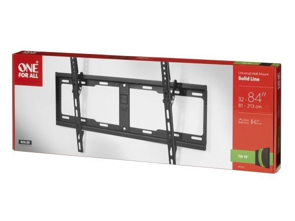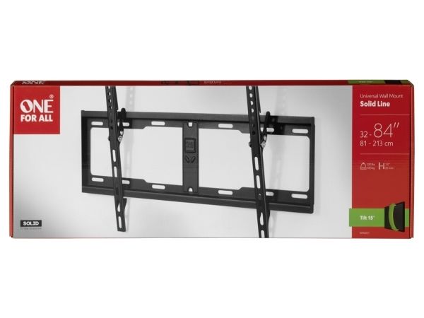 One For All SOLID WM 4621-fästet är utformat för att ge ett säkert och tillförlitligt sätt att montera plattskärmar från 32 till 84 tum. Den här väggmonterbara enheten har en lutning på 15°, vilket ger en förbättrad betraktningsvinkel och minskar bländning från omgivande ljus. WM 4621 är konstruerad med en maximal lastkapacitet på 100 kg, vilket garanterar stabilitet och gör det enkelt att montera skärmar av olika storlekar och vikter. Fästet är utrustat med ett mångsidigt gränssnitt för montering av platta skärmar och stöder flera olika monteringsmönster, t.ex. 100 x 100 mm, 200 x 200 mm och upp till 600 x 400 mm. Denna flexibilitet gör det lämpligt för ett brett utbud av platt-TV-apparater, vilket garanterar en perfekt passform för nästan alla modeller. WM 4621:s robusta design och kompakta storlek gör den till en utmärkt lösning för både hemmiljöer och professionella miljöer, där den förbättrar din tittarupplevelse samtidigt som den bibehåller en ren och modern estetik.