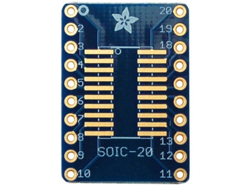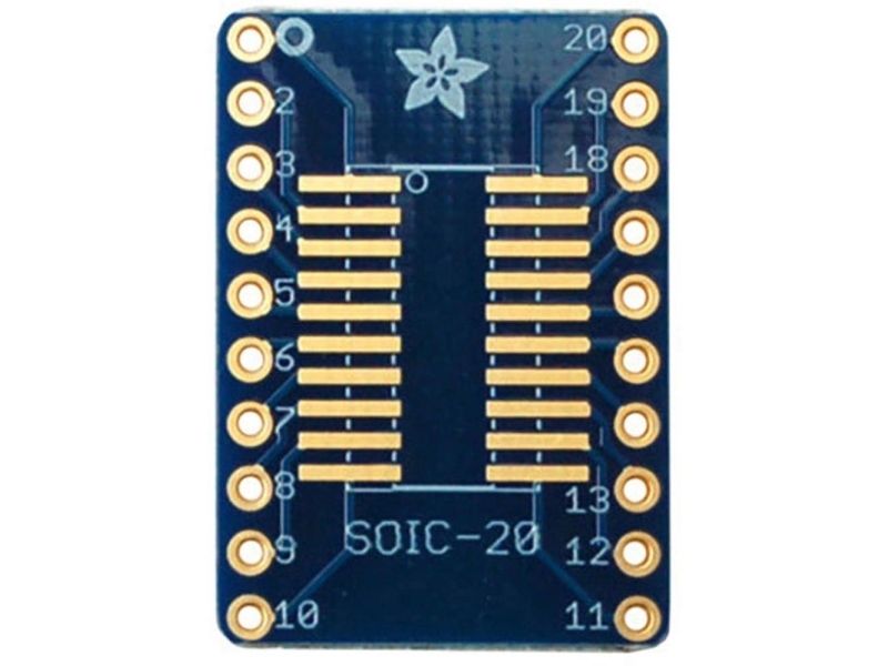 Beguiled by a fancy new chip that is only available in a SOIC or (T)SSOP pinout? This breakout PCB set will make your life much much easier and get you prototyping faster than ever. One side has a 20-TSSOP pin out with traces going to two rows of 0.1" spaced holes, the other has 20-SOIC. Solder your chip to either side and you're ready to rock on any solderless breadboard.