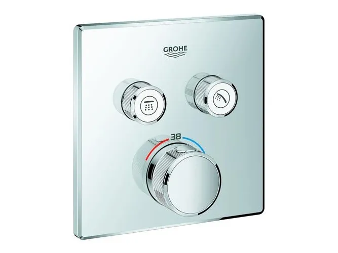 BRING EASE AND PRECISION INTO YOUR BATH AND SHOWER WITH THE GROHTHERM SMARTCONTROL THERMOSTAT Going with the flow is all very well – but sometimes you want to be in control. The Grohtherm SmartControl concealed thermostat lets you do just that. It puts ergonomic, push-button handling and chic styling at the heart of your cosmopolitan bathroom. The innovative SmartControl technology allows you to select your desired spray source and adjust the water volume with the push-turn of a button. The two valves mean you can switch effortlessly between – or combine – head and hand shower, or between shower and bath. Integrated GROHE TurboStat technology prevents any unpleasant temperature fluctuations. GROHE EasyLogic markings and textured buttons with exchangeable symbols make it easy and intuitive to use. Family-friendly, the GROHE SafeStop override button allows you to set a maximum temperature of 38° C to prevent scalding – the GROHE SafeStop Plus optional temperature limiter lets you add a further limit of 43° C for an extra level of safety. Water-saving GROHE EcoJoy technology gives you the option of a reduced flow rate with no compromise on enjoyment. Thanks to the GROHE QuickFix system it’s swift and straightforward to install. The slim profile makes it easy to keep clean, and the dazzling, durable GROHE StarLight chrome finish will look pristine for years to come. With a slim, square design perfect for that minimalist, streamlined look, this product is bound to enhance your bathroom scheme. Please note that this product must be installed in combination with the GROHE Rapido SmartBox (35600000).