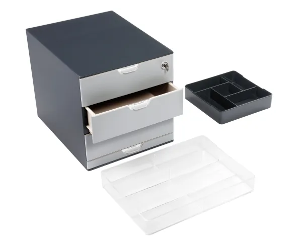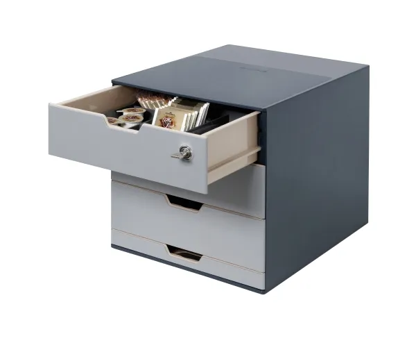 COFFEE POINT BOX\nThe COFFEE POINT BOX offers spacious, flexible and user-friendly storage and organisation of common catering supplies such as coffee capsules, tea bags, sugar packets and much more. It also protects coffee and tea pads from light and moisture. The set includes one COFFEE POINT BOX, one COFFEE POINT CASE and one COFFEE POINT CADDY. Every product in the series has its own place and fits perfectly into the practical drawer box. With its modern colours, the coffee dispenser is ideally suited for use in tea kitchens, lounge areas and meeting rooms.\n\n- Food-safe;\n- Dishwasher-safe;\n- Top drawer with cylinder lock;\n- Premium-quality plastic material (ABS);\n- High stability due to non-slip stand pads;\n- Rubber feet protect surfaces from scratches;\n- With pull-out stop and drawer feeder;\n- Recessed grip on the drawer front.\n\nDimensions: 280 x 292 x 356 mm (W x H x D)