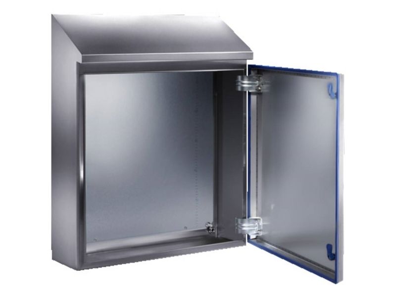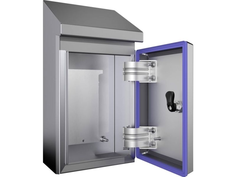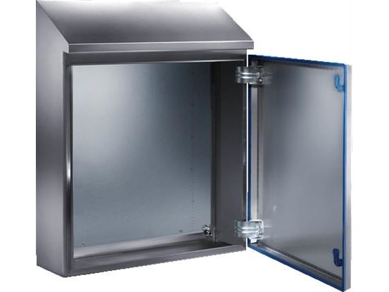 Enclosure with 30° roof tilt. Interior hinges, an all-round gap-free silicone seal and hygiene-compliant lock inserts ensure that the design meets cleanliness standards.