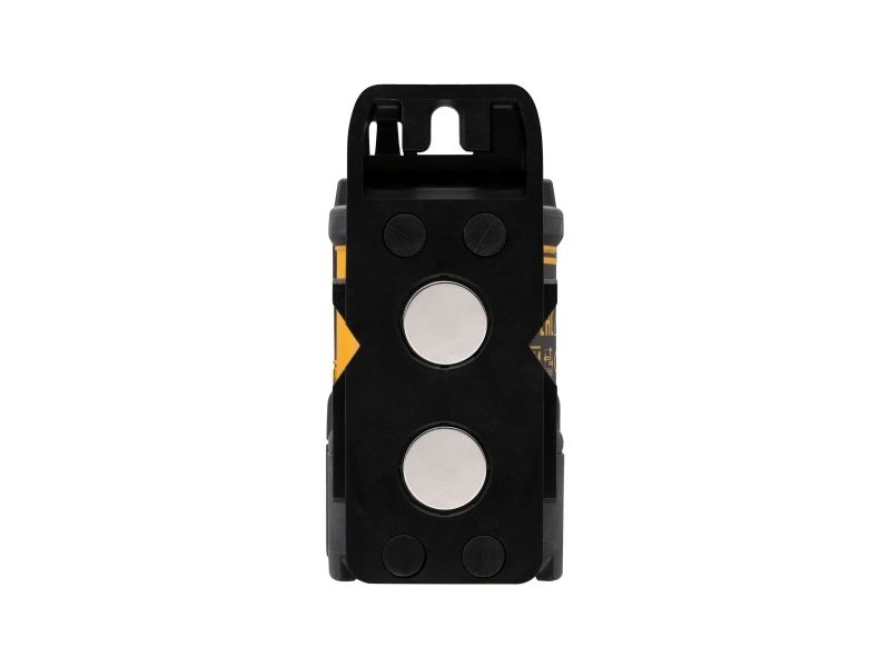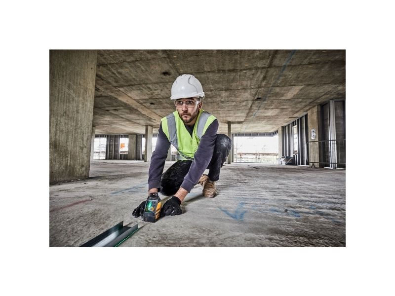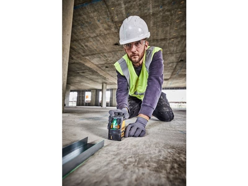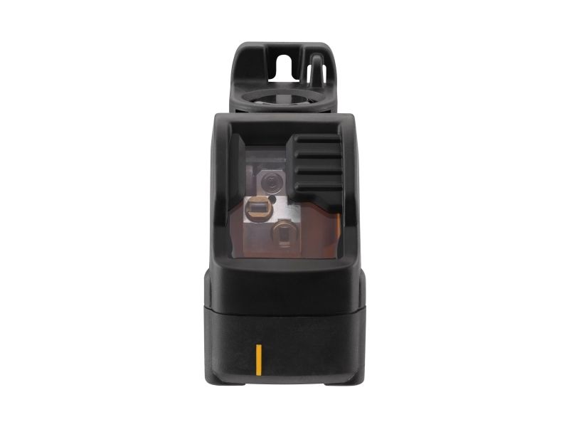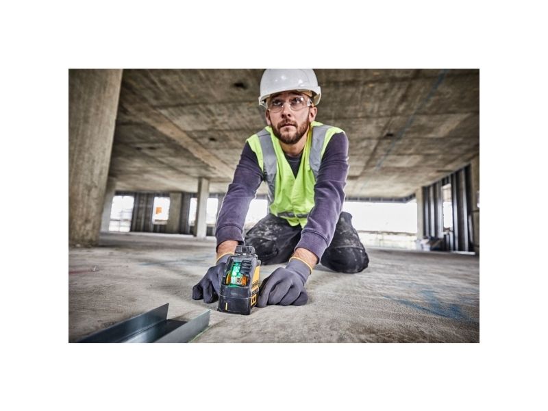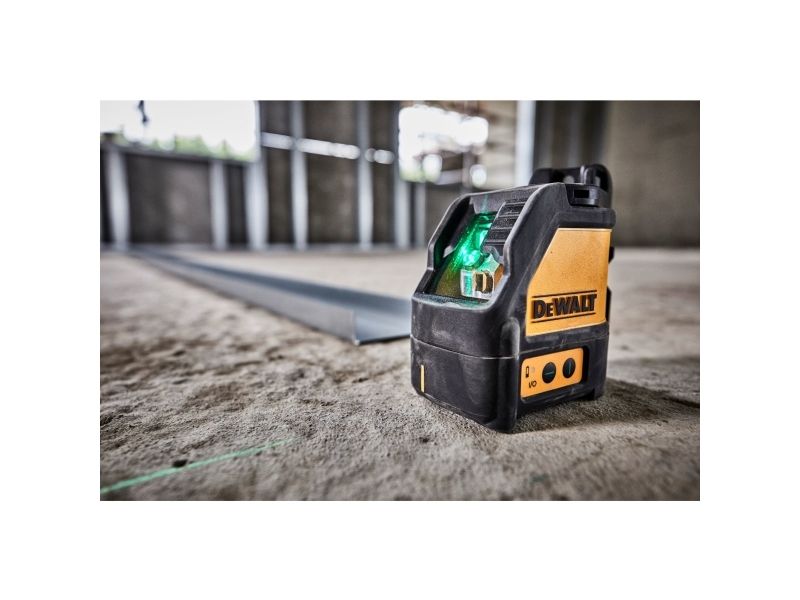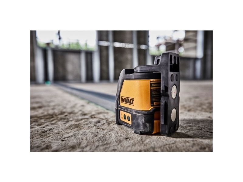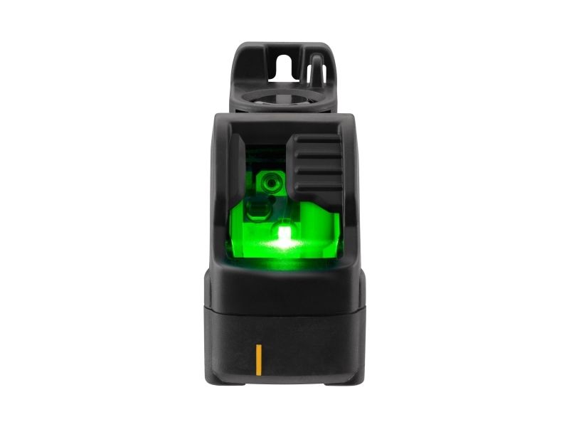 Korslinjeläge, horisontellt läge, vertikalt läge, 6,35 mm stativgänga, batterinivåindikator, bas med inbyggda magneter, grön laserstråle, formgjutet hölje