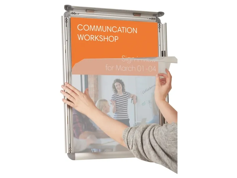 De väderbeständiga Nobo-snäppramarna är lämpliga för både inomhus- och utomhusbruk och ger enkel åtkomst till information som behöver bytas ut ofta. Lyft bara upp kanterna på aluminiumramen för att sätta in ett nytt anslag eller plansch. Tillbehör finns tillgängliga för både den väggmonterade modellen och det fristående stället så att du kan anpassa dina displayer.