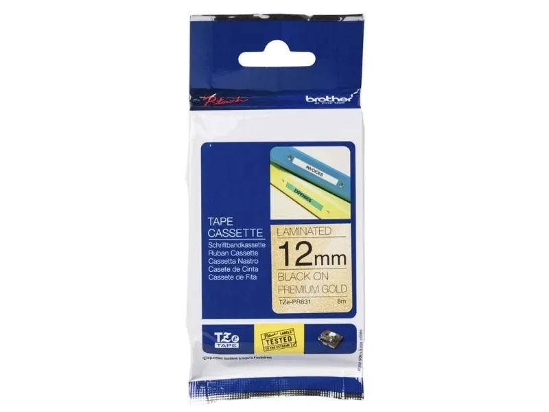 Brother original TZe-PR831 är en exklusiv premiumtape med svart text på glittrig guldbakgrund. Använd tapen för att skriva ut stilfulla placeringskort till bröllop eller dop. Tapen är också perfekt för att märka kort till buffébord på ett stilfullt sätt. Vill du ha din gåva skall bli ihågkommen? Använd premiumtape för att skriva ut personliga gratulationer till din present. Den laminerade tapen garanterar att dina etiketter skyddas mot skador. Kompatibel med P-touch-etikettskrivare som visar TZ- eller TZe-logotypen på kassettkåpan.