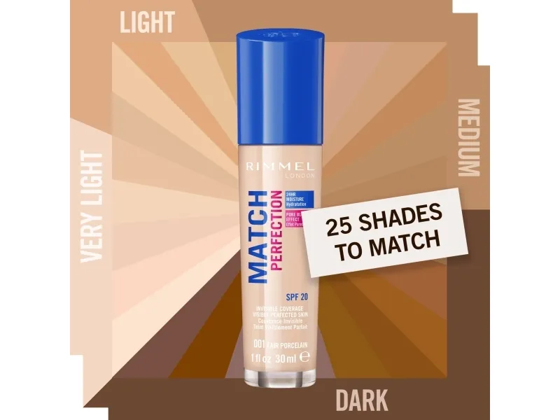 Your perfect foundation colour match is right here. Ace your base with Rimmel London Match Perfection Foundation; a medium coverage formula with smart-tone technology that matches 99% of UK skin tones. Yaaassss.Create a smooth base with our range of foundation shades, featuring a 24-hour moisture complex and soft-focus powders to glide over pores, dark circles and imperfections. Did someone say 'flawless'?- Medium coverage- Smart-tone technology- 24-hour moisture complex- Up to SPF 20