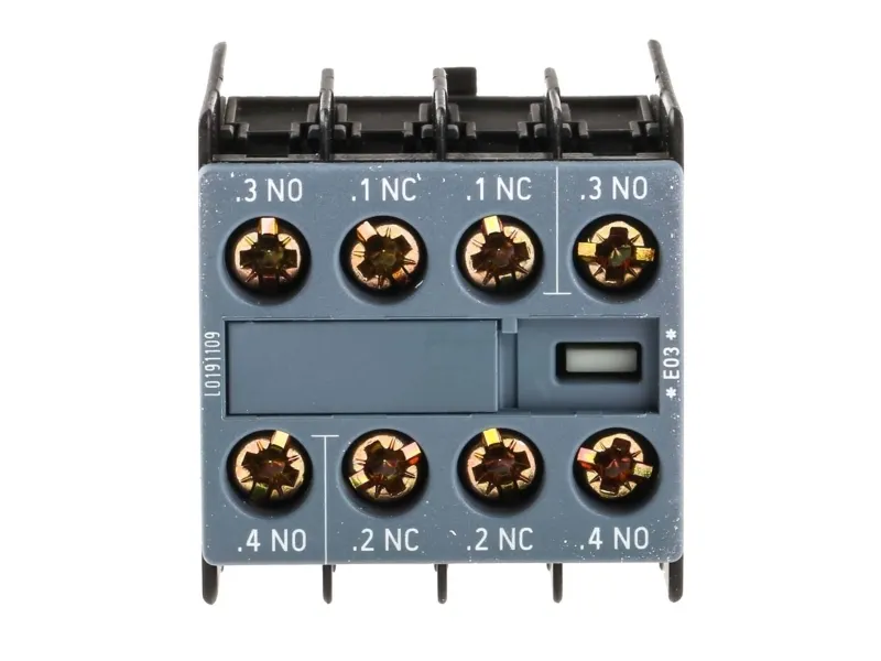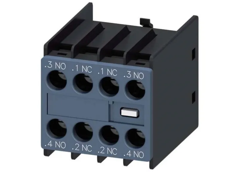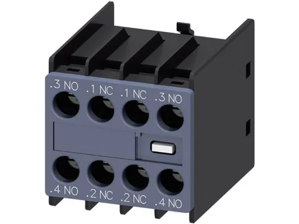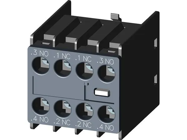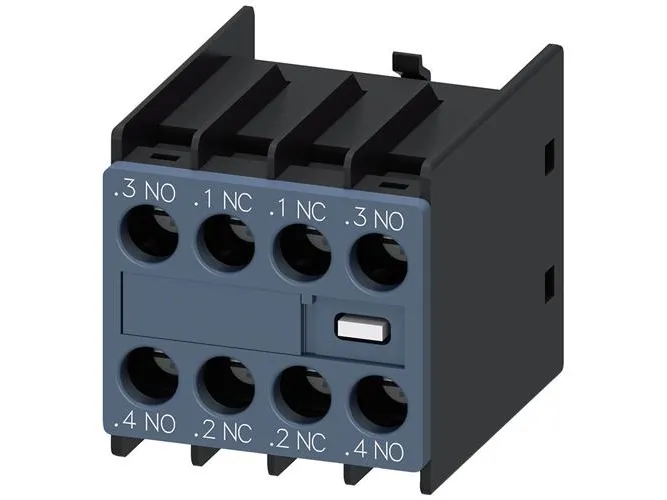 Auxiliary switch on the front, 2 NO + 2 NC Current path 1 NO, 1 NC, 1 NC, 1 NO for 3RH and 3RT screw terminal .3/.4, .1/.2, .1/.2, .3/.4 auxiliary switch SIRIUS 3RH29 for the expansion of auxiliary contacts in the control circuit.