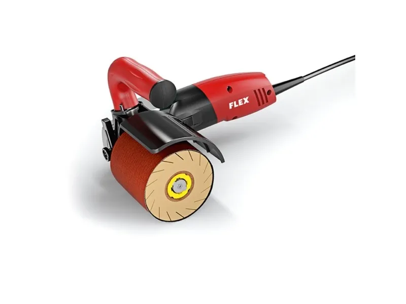 Burnishing machine and pipe belt sander TRINOXFLEX Set\n- Microprocessor control: speed selection, tachogenerator constant speed control, soft start, restart protection after power failure, overload protection and temperature monitoring\n- Unique tool attachment with quick-action coupling for tool-free changing of the system attachments for burnishing and pipe belt sanding\n- Variably adjustable burnishing attachment, allows working close up to the edge, also suitable for narrow rollers, incl. edge guide. Tool-free grinding tool change via patented quick-change system\n- Completely cast electronic components prevents damage due to metal dust. The 3-fold winding protection reduces motor wear, increases service life\n- Sanding belt dimension: 760 x 40 mm\n- High-quality, spring-mounted sanding arm: light alloy with 2 deflection rollers. For optimum wrap-round on pipes, up to max. 270°\n- Sanding belt replacement: quick and tool-free\n- Single-pole switch\n- Spindle lock\n- Adjustable guard: for sanding tools up to Ø 125 mm\n- For optimum finishing of various materials, for burnishing, texturing, polishing, brushing, smoothing, de-rusting and deburring steel and stainless steel surfaces
