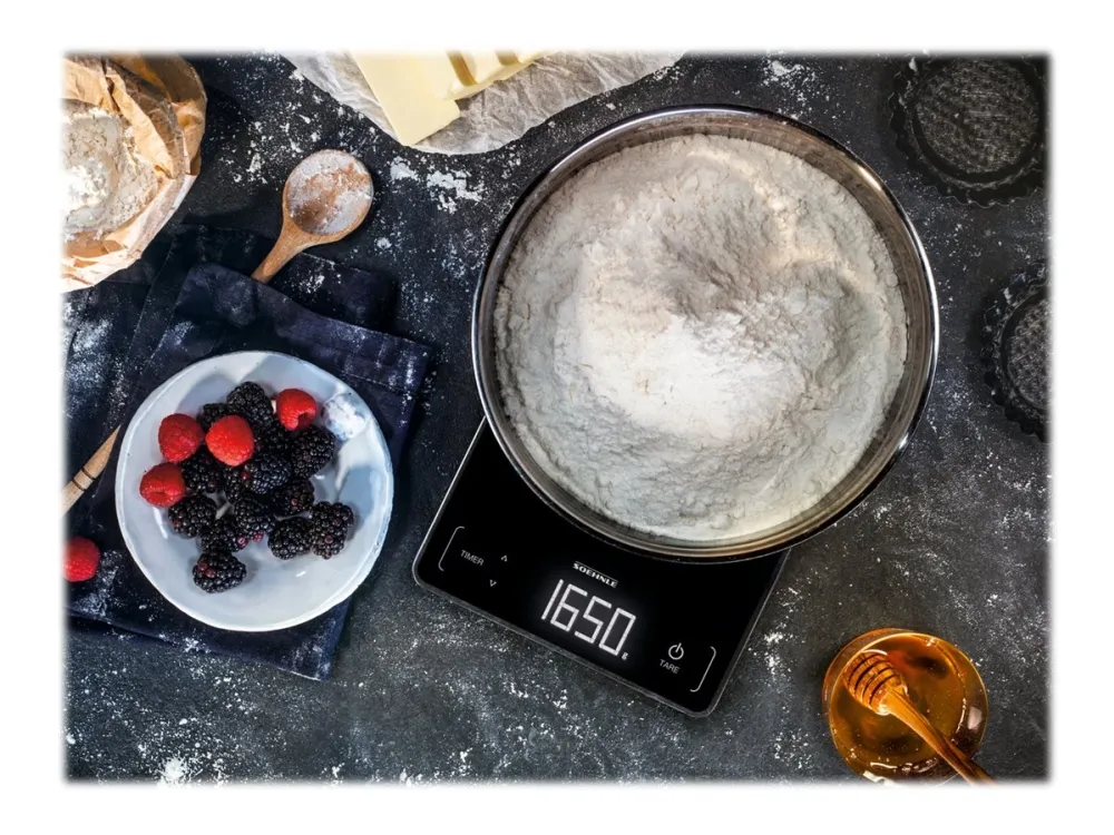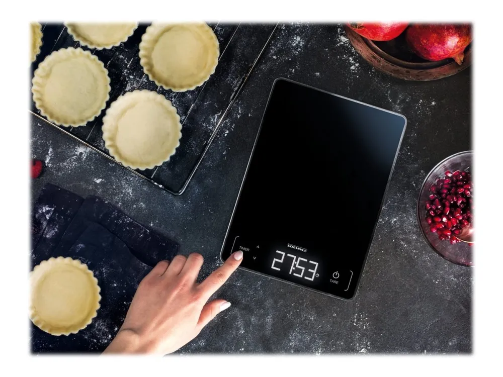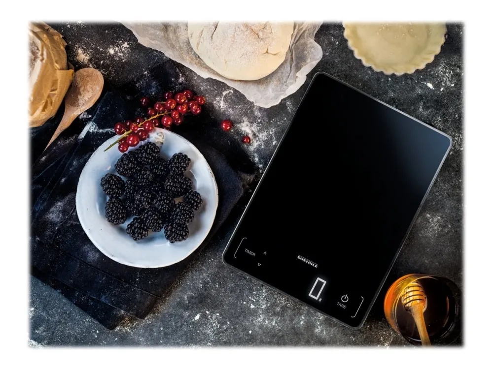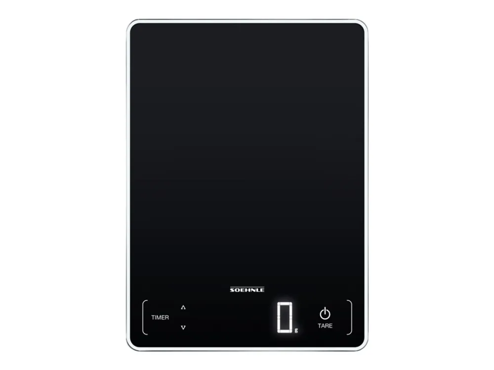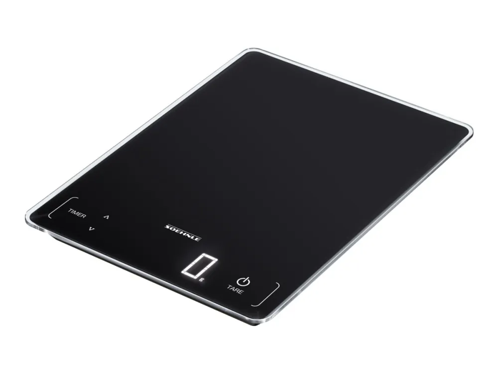 The Page Profi 100 digital kitchen scale is a true kitchen professional. It features an extra-slim surface for accurately weighing all ingredients to the very last gram and also comes with an integrated timer to ensure you never lose track of those crucial cooking times. Furthermore, with its extra-large LED display, cooking time and weight are easy to see, even in poor lighting. Special feature: The white numbers on the scale’s patented LED display only light up when the scale is switched on. When switched off, the scale looks like a shiny black glass surface.\n\nWeighing large quantities of ingredients—for example, when making jam—has never been so easy, thanks to the scale’s impressive 15 kg weight capacity. Lots of ingredients can be placed on top of this extra-large kitchen scale in a large bowl or pot and weighed at the same time. And if you forget something, it can be easily added using the scale’s tare function. The Page Profi 100 is operated using two patented Sensor Touch fields, which are integrated seamlessly within the glass weighing surface and respond to the lightest of touches. This not only makes operation more convenient but makes the weighing surface easy to clean. When not in use, the kitchen scale can be stored in a cupboard, drawer or hung on the wall to save space: A particularly practical solution that keeps the timer close to hand at all times. The automatic switch-off function makes the Page Profi 100 incredibly energy efficient: The batteries it's supplied with will last one year, even if the scale is used every day.\n\n- 2-in-1: A kitchen scale with convenient integrated kitchen timer\n- Extra-large LED display with white illuminated digits for optimum readability\n- An innovative, patented solution: The display is invisible when switched off\n- Extra weight-bearing capacity up to a maximum of 15 kg (accurate to 1 g increments)\n- Extra-large weighing surface for large bowls and pans\n- Practical weighing function (tare) for easy weighing of various ingredients in one bowl\n- Patented Sensor Touch technology for comfortable operation and easy cleaning of the weighing surface\n- Especially energy-efficient thanks to the automatic on/off function\n- Ultra-slim design for space-saving storage\n- Anti-slip feet make it safe to stand on