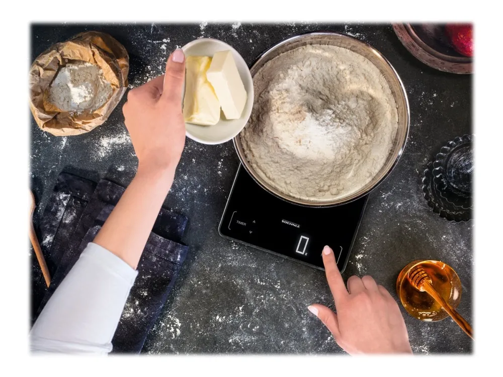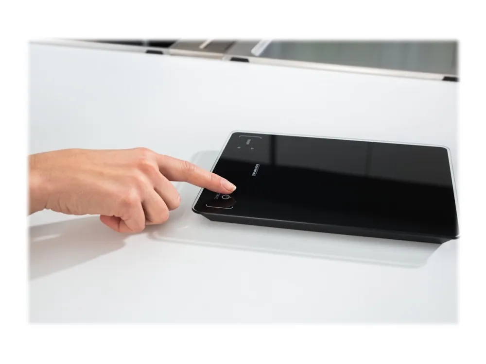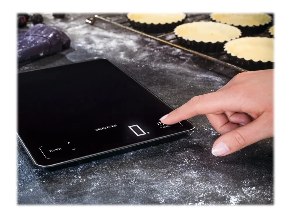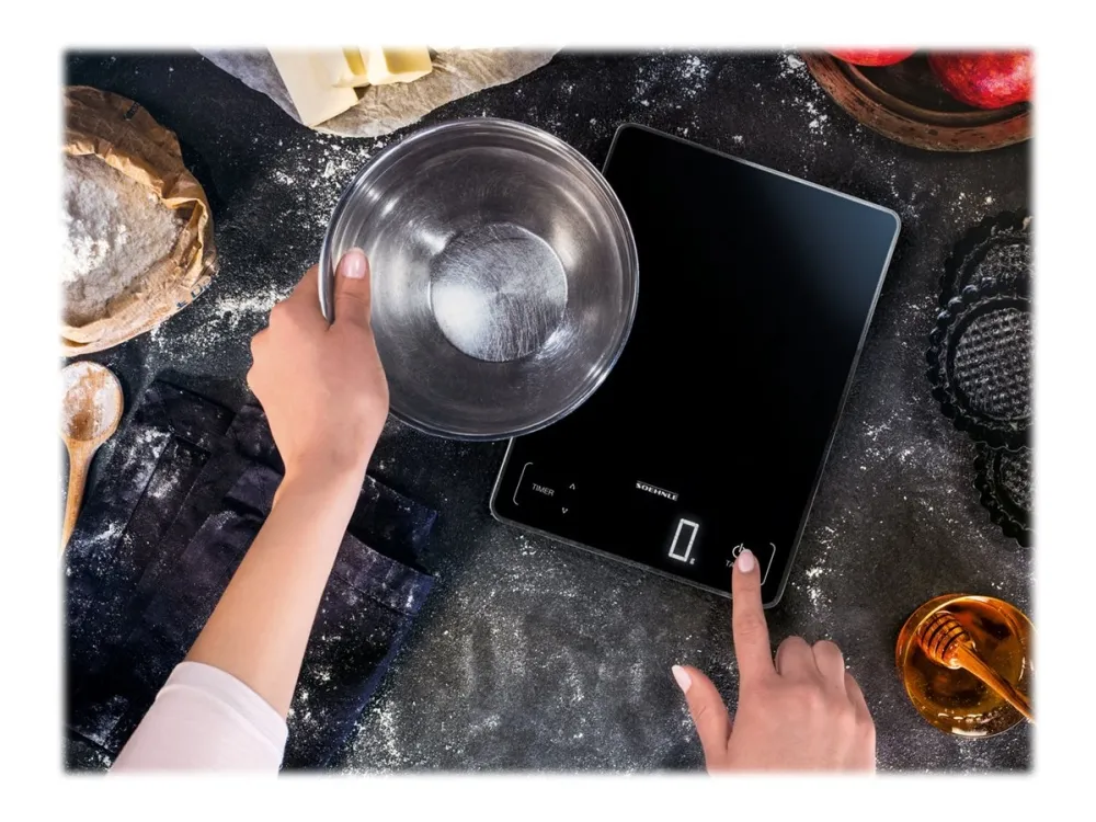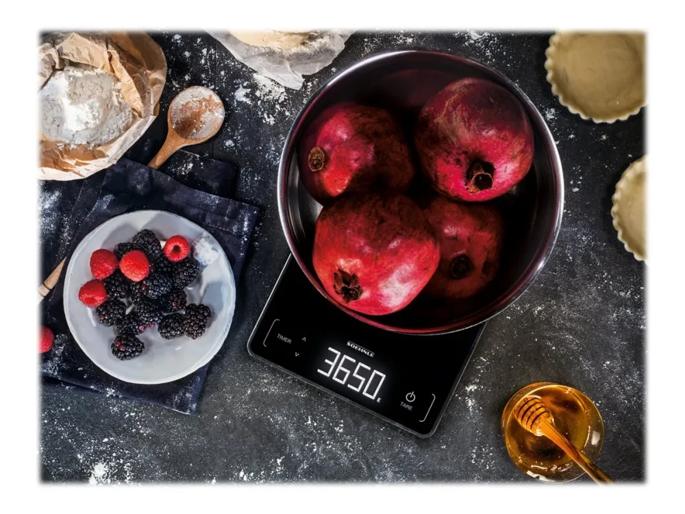 The Page Profi 100 digital kitchen scale is a true kitchen professional. It features an extra-slim surface for accurately weighing all ingredients to the very last gram and also comes with an integrated timer to ensure you never lose track of those crucial cooking times. Furthermore, with its extra-large LED display, cooking time and weight are easy to see, even in poor lighting. Special feature: The white numbers on the scale’s patented LED display only light up when the scale is switched on. When switched off, the scale looks like a shiny black glass surface.\n\nWeighing large quantities of ingredients—for example, when making jam—has never been so easy, thanks to the scale’s impressive 15 kg weight capacity. Lots of ingredients can be placed on top of this extra-large kitchen scale in a large bowl or pot and weighed at the same time. And if you forget something, it can be easily added using the scale’s tare function. The Page Profi 100 is operated using two patented Sensor Touch fields, which are integrated seamlessly within the glass weighing surface and respond to the lightest of touches. This not only makes operation more convenient but makes the weighing surface easy to clean. When not in use, the kitchen scale can be stored in a cupboard, drawer or hung on the wall to save space: A particularly practical solution that keeps the timer close to hand at all times. The automatic switch-off function makes the Page Profi 100 incredibly energy efficient: The batteries it's supplied with will last one year, even if the scale is used every day.\n\n- 2-in-1: A kitchen scale with convenient integrated kitchen timer\n- Extra-large LED display with white illuminated digits for optimum readability\n- An innovative, patented solution: The display is invisible when switched off\n- Extra weight-bearing capacity up to a maximum of 15 kg (accurate to 1 g increments)\n- Extra-large weighing surface for large bowls and pans\n- Practical weighing function (tare) for easy weighing of various ingredients in one bowl\n- Patented Sensor Touch technology for comfortable operation and easy cleaning of the weighing surface\n- Especially energy-efficient thanks to the automatic on/off function\n- Ultra-slim design for space-saving storage\n- Anti-slip feet make it safe to stand on