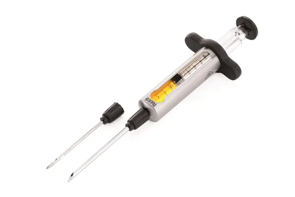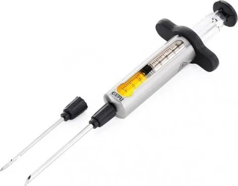 Ideal aid to inject gravy, marinades and dissolved seasoning.\n\nA marinade nozzle is useful if you want to marinade or season your meat for the barbecue or the oven from inside, especially with big pieces of meat. Just draw the desired liquid into the syringe, insert the needle into the meat and push the liquid out with the plunger. !Do not fill with hot liquids. The syringe will get very hot. Risk of injury!\n\n- Consisting of two needles, a plunger and a container\n- Capacity 40ml / 1.5 oz\n- L 27,0 cm, W 8,1 cm, H 4,1 cm\n- high-grade stainless steel\n- dishwasher safe
