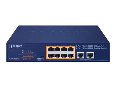 PLANET GSD-1008HP är en mångsidig switch som är utformad för effektiv nätverksprestanda. Denna switch stöder Power over Ethernet (PoE+) så att enheter kan strömförsörjas direkt via nätverkskabeln, vilket förenklar installationer och minskar kabeltrassel. Den har 10 portar, varav 8 är PoE+-kompatibla, vilket ger en PoE-budget på 120 W och säkerställer att flera enheter kan anslutas och strömförsörjas samtidigt. Denna produkt uppfyller olika nätverksstandarder, inklusive IEEE 802.3, och har funktioner som VLAN-stöd, lagrings- och vidarebefordringsfunktioner samt en inbyggd DIP-omkopplare för konfigurationsjusteringar. Prestandan förbättras av en switchbandbredd på 20 Gbps och en switchgenomströmning på 13,4 Mpps, vilket gör den till ett pålitligt val för både hem- och kontorsmiljöer. GSD-1008HP är konstruerad för att tåla en rad olika miljöförhållanden och fungerar effektivt i temperaturer från 0 °C till 50 °C och lagringstemperaturer upp till 70 °C, vilket garanterar tillförlitlig drift i olika miljöer. Metallhöljet ökar hållbarheten, medan 8KV ESD-skyddet skyddar anslutna enheter från elektriska överspänningar. Denna enhet är idealisk för installationer som kräver både rackmontering och placering på skrivbordet och stödjer moderna nätverksbehov.