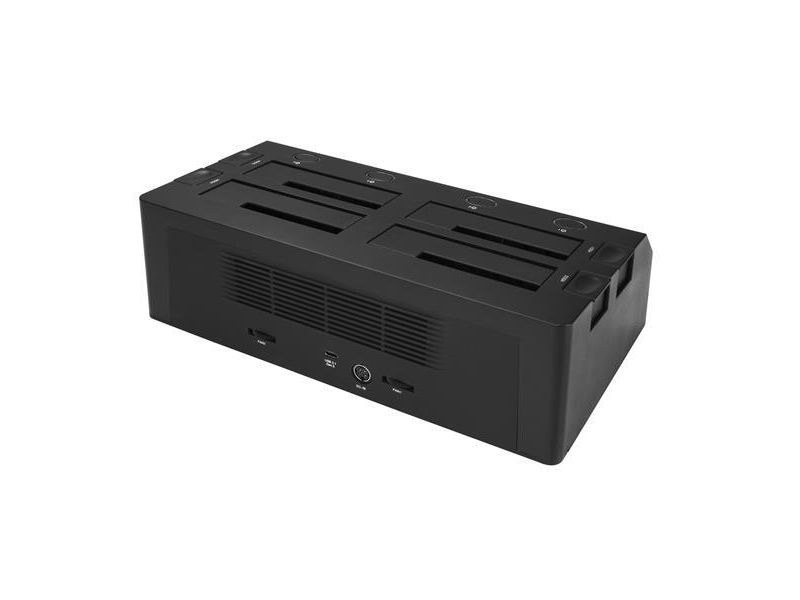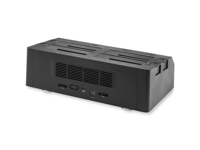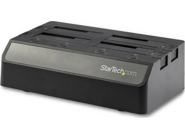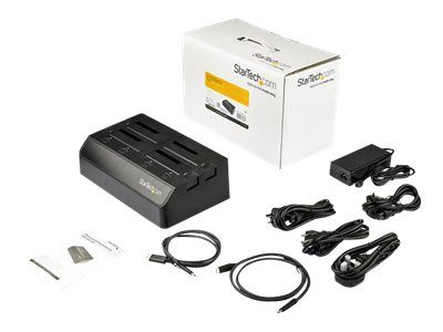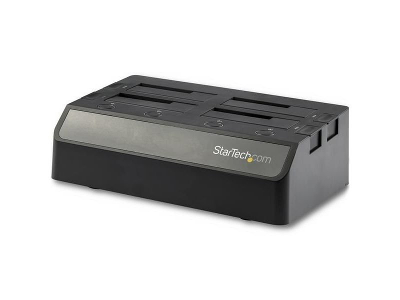 Denna SATA/HDD dockningsstation med 4 fack ger dig åtkomst till upp till fyra SSD-enheter eller hårddiskar samtidigt över USB 3.1 (10 Gbps) och enkla hot swap-byten av enheter. Dockningsstationen är perfekt för IT-proffs och ger stor datakapacitet och snabba filöverföringar, vilket hjälper dig att hantera ditt arbetsflöde mer effektivt. Spara tid med att komma åt och hantera dina data När du hanterar ett stort antal enheter sparar HDD/SSD-dockningsstationen tid. Docka och byt snabbt dina enheter för skivavbildning, dataåterställning från felaktiga enheter, säkerhetskopiering av data eller andra uppgifter. Dockningsstationen för hårddiskar har även SMART-stöd för att möjliggöra åtkomst till viktiga enhetsdata, t.ex. timmar i bruk, antal strömcykler, diskhälsa Snabb dataöverföring Med USB 3.1 Gen 2 gör dockningsstationen att du kan utnyttja de senaste SSD-enheternas och hårddiskarnas höga prestanda och samtidigt minska flaskhalsar i dina dataöverföringar. Enkel kompatibilitet Dockningsstationen för hårddiskar inkluderar en USB-Type C-kabel för anslutning till USB-C-utrustade bärbara datorer och enheter, och en USB-Type A-kabel för bakåtkompatibilitet med dina befintliga USB 3.0, 2.0 och 1.x-enheter. Dockningsstationen fungerar dessutom med 2,5" och 3,5" IDE-hårddiskar, mSATA-enheter och M.2-enheter med hjälp av en kompatibel adapter från StarTech.com: IDE-hårddiskar: Använd StarTech.coms adapter SAT2IDEADP SATA till 2,5" eller 3,5" IDE-hårddiskadapter för HDD-dockningsstationer. mSATA-hårddiskar: Använd StarTech.coms adapter SAT32MSAT257 mSATA SSD till 2,5" SATA-adapter-konverterare. M2-hårddiskar: Använd StarTech.coms adapter SAT32M225 M.2 NGFF SSD till 2,5" SATA-adapter-konverterare.