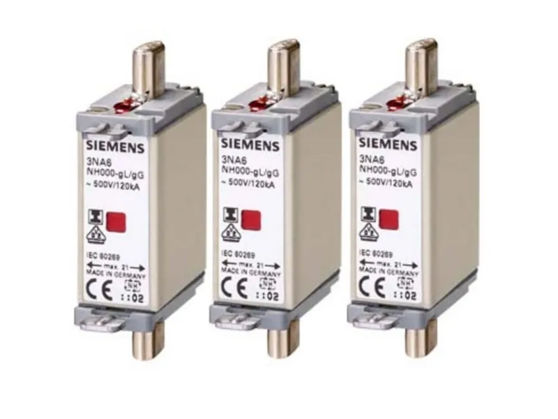NH-sikringsindsats, NH000, i: 35 A, GG, UN AC: 500 V, UN DC: 250 V, kombisensor, isolerede lasker til NH-sikringssystem 3NA, 3ND til selektiv lednings- og anlægsbeskyttelse. NH-sikringssystemet fra Siemens som vigtig del af SENTRON beskyttelseskomponenter til el-installationer giver effektiv person-, apparat- og anlægsbeskyttelse med sikker frakobling i tilfælde af overbelastning og kortslutning. I sammenligning med ledningsbeskyttelseskontakter kan højere kortslutningsstrømme opnås samtidig med bedre strømbegrænsning. NH-sikringssystemet er især kendetegnet ved: 1. Kombialarmen signalerer, at sikringen slukkes ved hjælp af et tydeligt farveskift, der går fra rød til hvid. 2. Mere sikkerhed ved udskiftning med isolerede gribeflige. 3. Høj selektivitet og lave omkostninger. 4. Langvarig og sikker drift takket være forsølvede kontaktknive. 5. Sikringsindsatser på 2 A til 1250 A og i størrelserne 000, 00, 0, 1, 2 3, 4 og 4a.