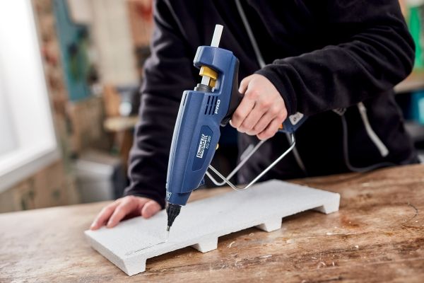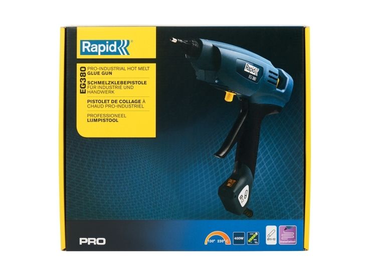Rapid EG380 Industriell limpistol för intensiv användning V21 Box. 400 W. Limflöde upp till 2,2 kg/h. Temperaturkontroll. Snabb limuppvärmning (mindre än 5 min.) Använder limstavar med 12 mm diameter.