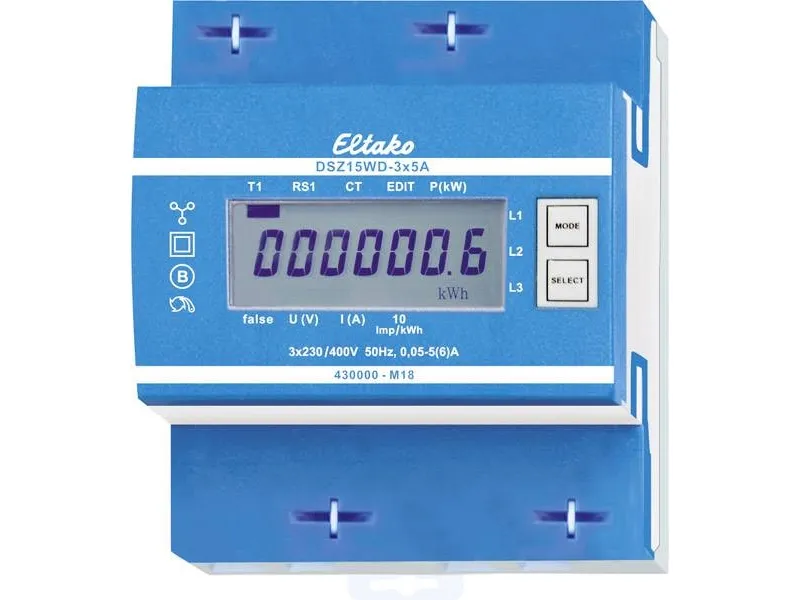 Omformer-trefasestrømmåler, MID kalibreretKun kalibrerede tællere er godkendt til strømregning i henhold til § 25 i den tyske kalibreringslov. Manglende overholdelse er en overtrædelse af ordensforskrifter i henhold til §19. Omformer-trefasestrømmåler med aftageligt transformerforhold og MID. Maximalstrøm 3x5A, stand-by-tab kun 0,5 watt pr. sti. Rækkeindbygningsapparat til montering på bæreskinne din en 60715 TH35. 4 delingsenheder = 70 mm bred, 58 mm dyb. Nøjagtighedsklasse B (1 %). Med S0-interface. Denne trefasestrømmåler måler driftsenergi ved hjælp af strømme gennem transformerne. Egetforbrug på kun maks. 0,5 watt aktiv effekt pr. sti måles ikke og vises ikke. Der kan tilsluttes 1, 2 eller 3 omformere med sekundærstrøm op til 5 A. Startstrømmen er 10 mA. N-tilslutningen skal være til stede. LC-displayet med 7 segmenter kan også aflæses to gange i løbet af to uger uden strømforsyning. Effekteferencen vises med en 10 gange pr. kWh blinkende bjælker i displayet. Højre ved side