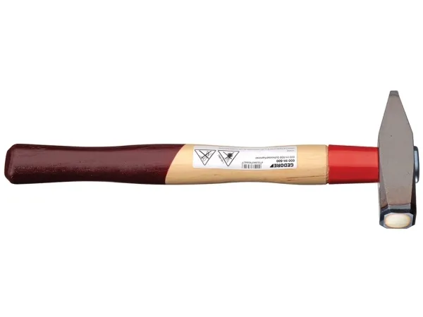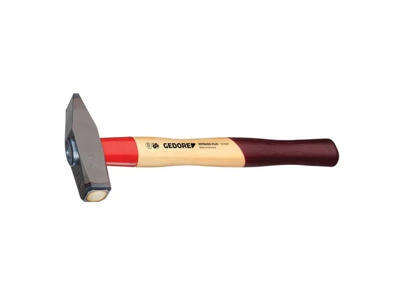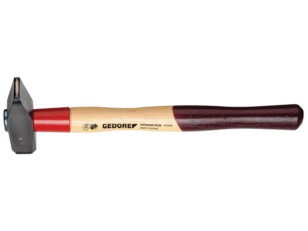Forged hammer head DIN 1041. The edges of the flat side of the head are induction hardened. With contoured hickory handle DIN 5111, additionally shaped with a long hardened handle protective steel sleeve. The tapered collar, fixing plate and wood screw bond the hammer head and the handle into one unit. ROTBAND-PLUS handle join, high working safety, long service life, best price-performance ratio.
