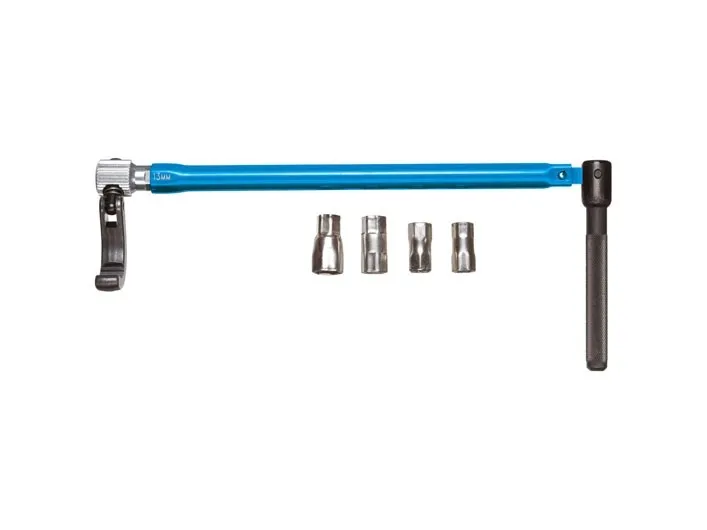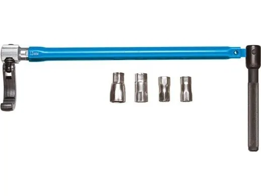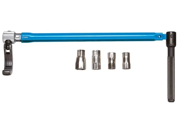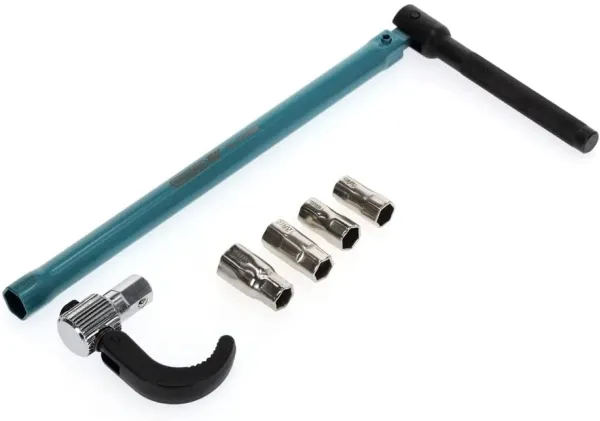 For single lever taps and taps with central screw connection up to size 36 mm. With 13 mm hexagon drive and additional adaptors for 9, 10, 11 and 14 mm. With pivoted hook for right or left hand operation. Enamelled blue.