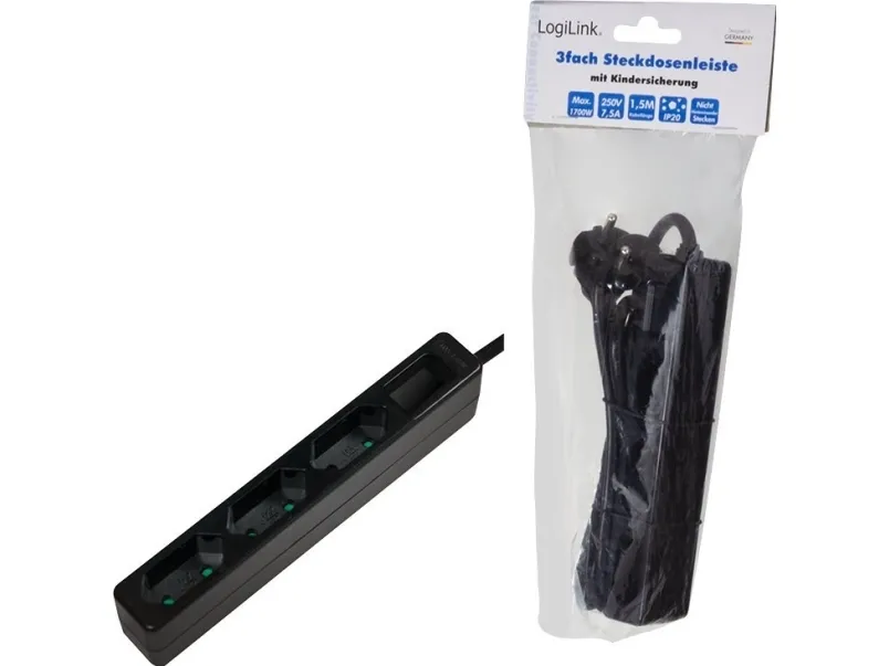 LogiLink LPS229B. Cable length: 1.5 m, Placement supported: Indoor, Power plug type: Type C. AC outlets quantity: 3 AC outlet(s). AC input voltage: 250 V, AC input frequency: 50 Hz, Maximum input power: 1700 W. Width: 25 mm, Depth: 171 mm, Height: 38 mm. Package width: 220 mm, Package depth: 120 mm, Package height: 50 mm